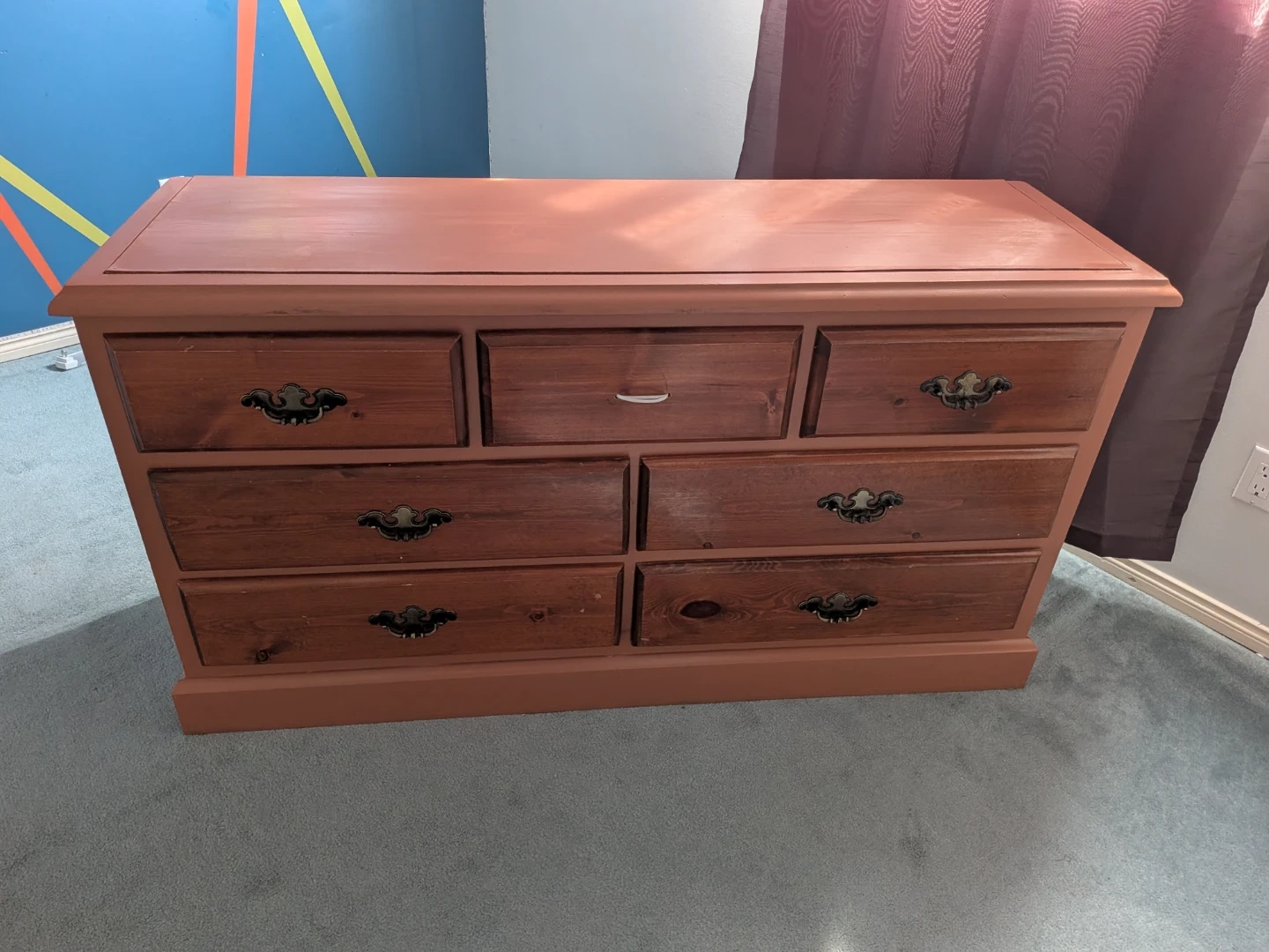 This dresser has a total of seven drawers for storage. It features a unique rustic wood finish with a painted exterior. The handles are decorative metal one drawer is missing a handle easy fix.
