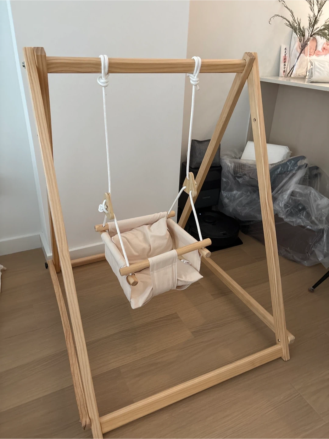 This is a wooden baby swing with a fabric seat. It's foldable for easy storage and transport. The weight limit is 33 lbs. Dimensions are 37.9in wide, 33.3in deep, and 42.2in tall.