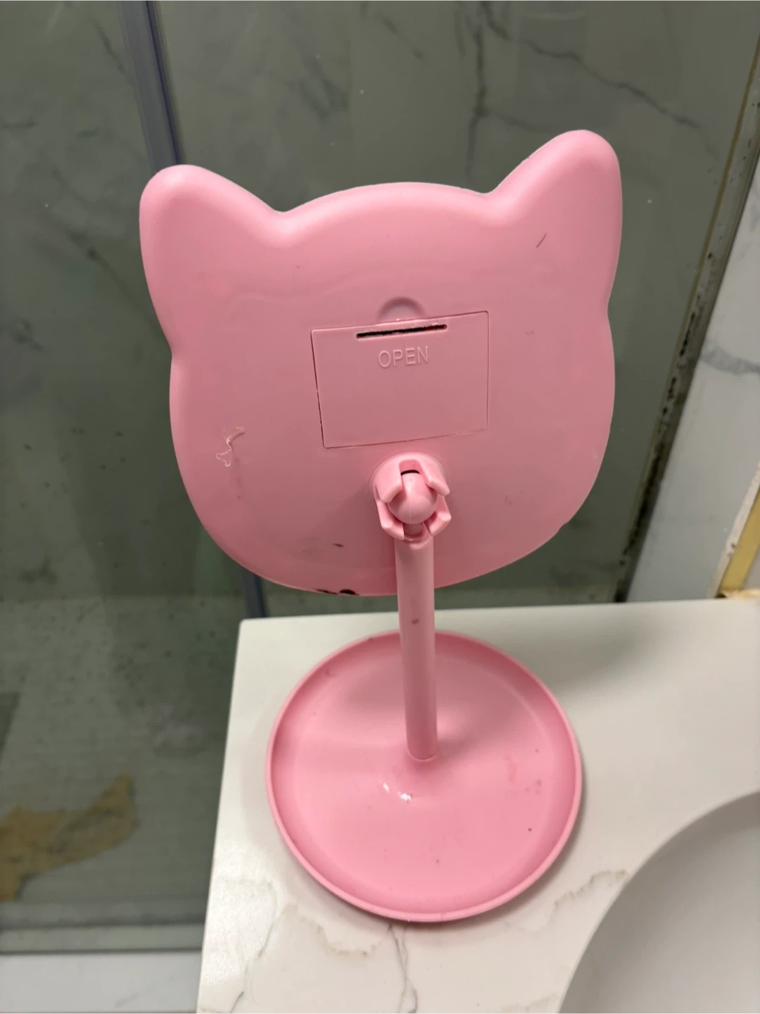 This is a pink cat-shaped makeup mirror with LED lights. It's designed for tabletop use and features a cute, playful aesthetic. The mirror is made of plastic and includes an 'OPEN' compartment on the back, likely for batteries.