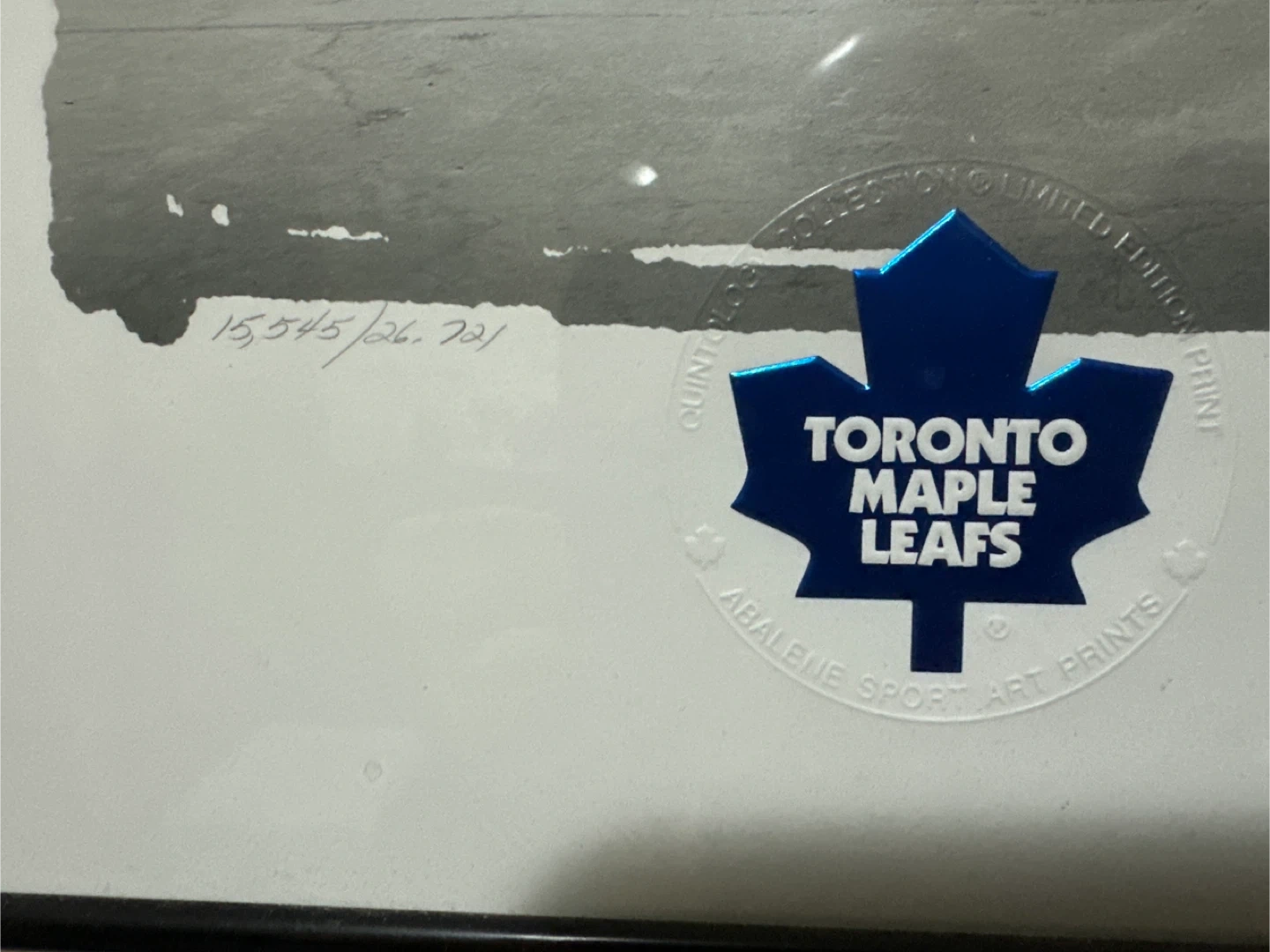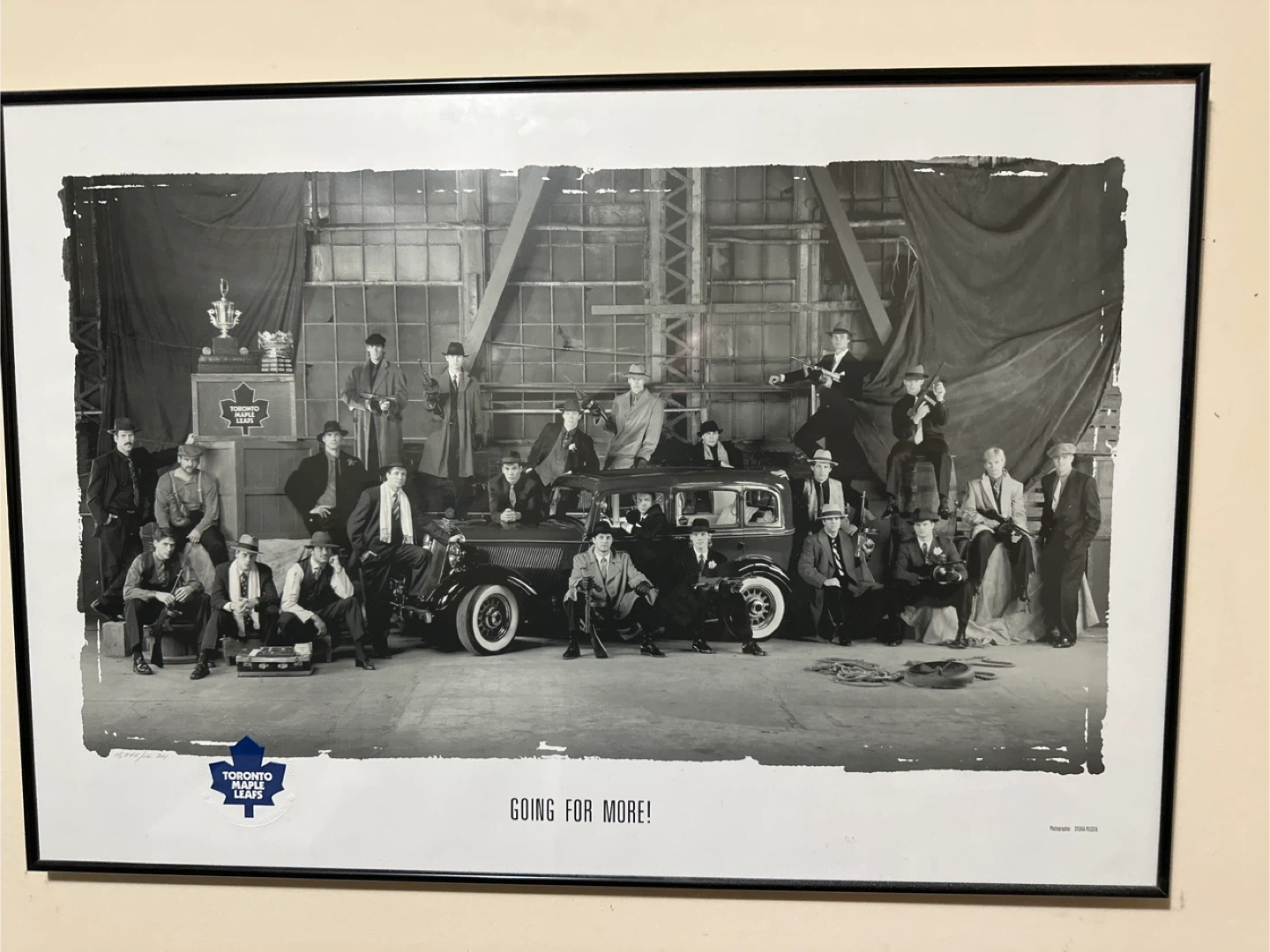 A limited edition print by photographer Sylvia Pecota featuring the Toronto Maple Leafs. This artwork is titled "Going For More!". It includes a number "15,545/26,721" inscribed on the print. It's framed in a black border.