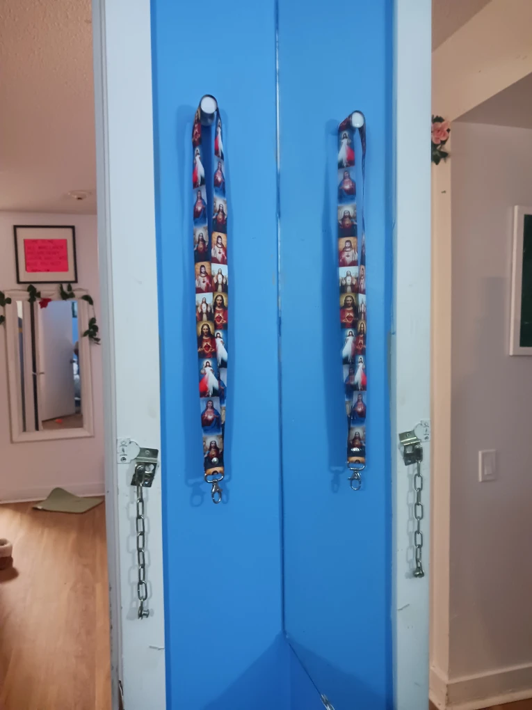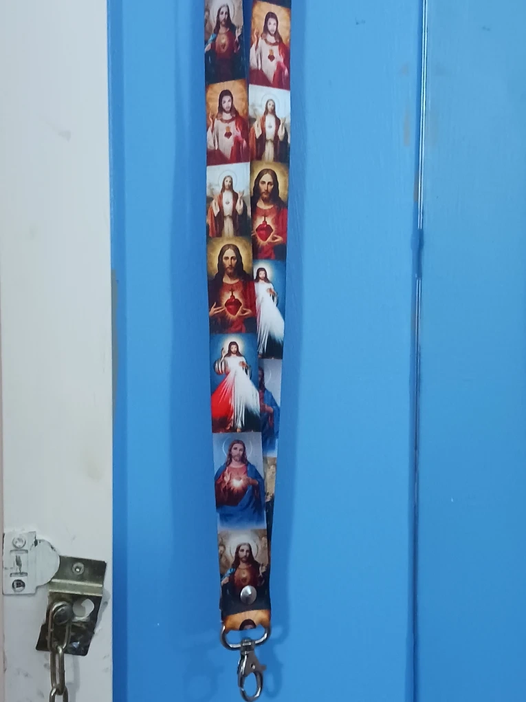 Selling a lanyard with religious imagery. The lanyard is brand newhas a metal clip for attaching items.