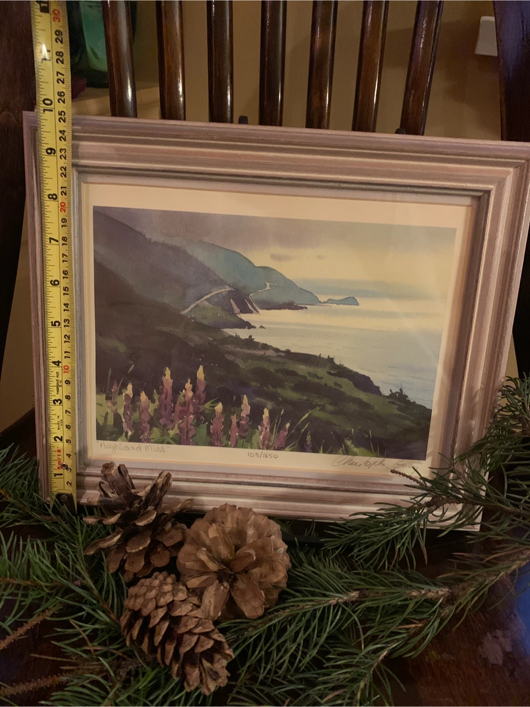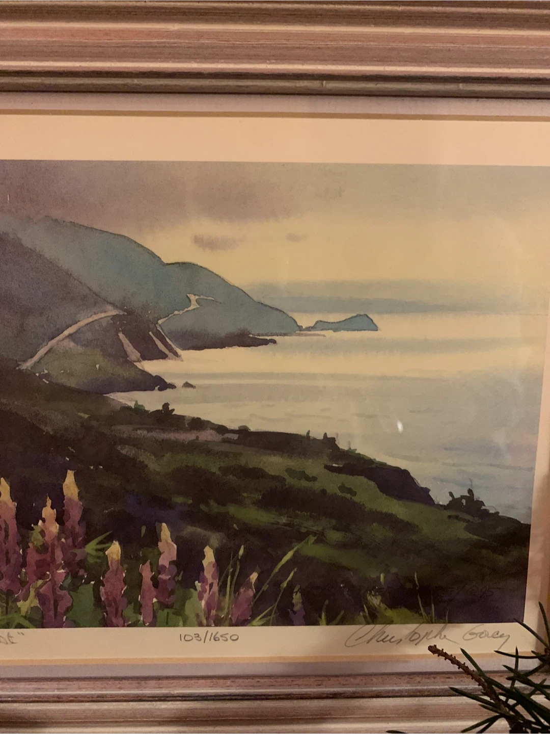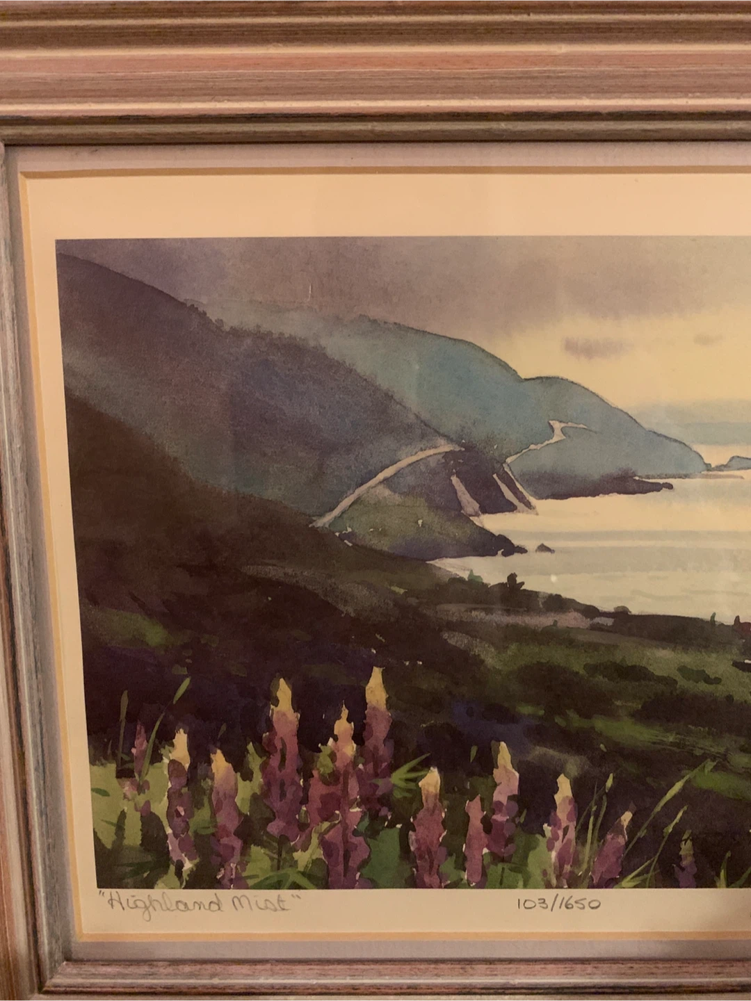 Selling a beautiful framed print titled, "Highland Mist” by Canadian watercolour artist Christopher Gorey. It's numbered 103/1650 and signed and dated ‘95 from the artist. It showcases the beautiful Cape Breton Cabot Trail in Nova Scotia with purple lupines in the foreground. The frame is a lovely blush wood colour. A lovely piece!