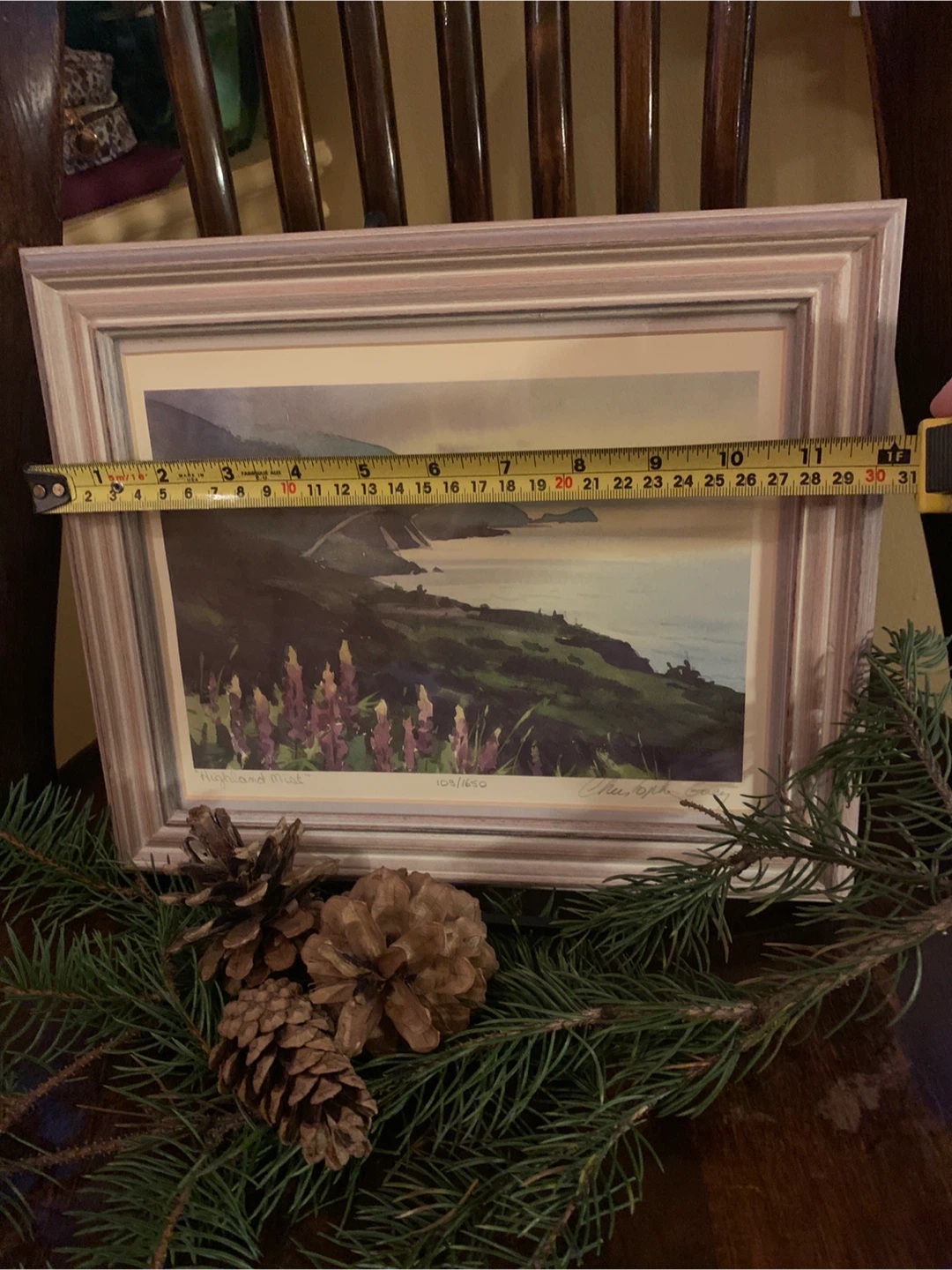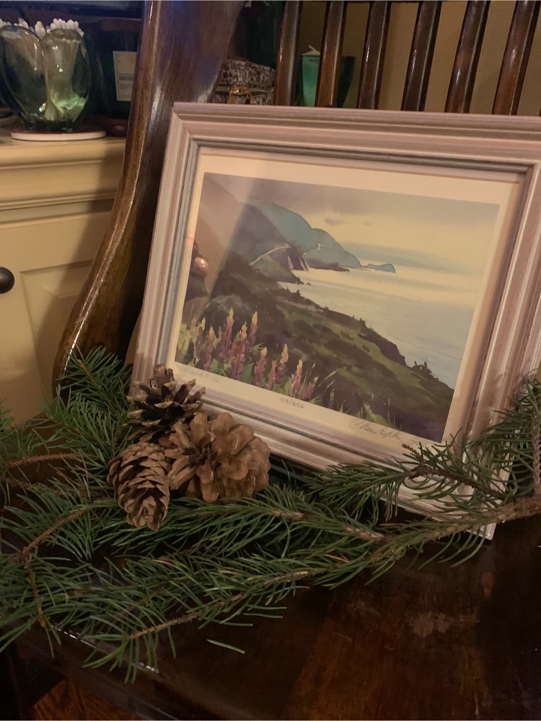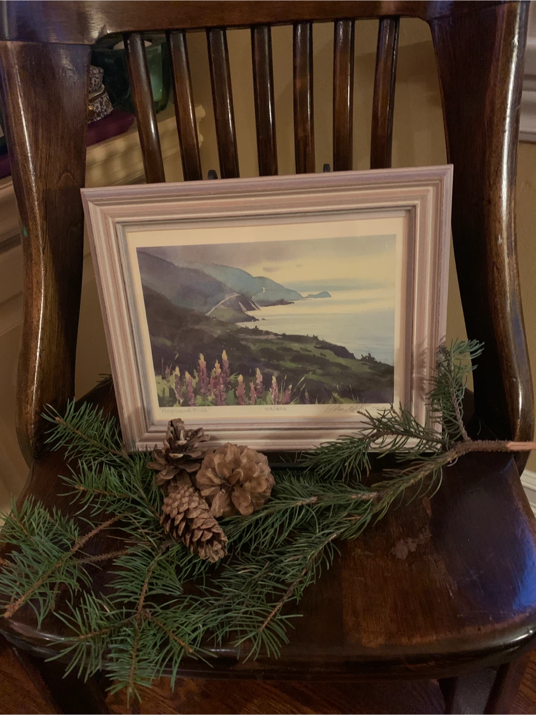 Selling a beautiful framed print titled, "Highland Mist” by Canadian watercolour artist Christopher Gorey. It's numbered 103/1650 and signed and dated ‘95 from the artist. It showcases the beautiful Cape Breton Cabot Trail in Nova Scotia with purple lupines in the foreground. The frame is a lovely blush wood colour. A lovely piece!