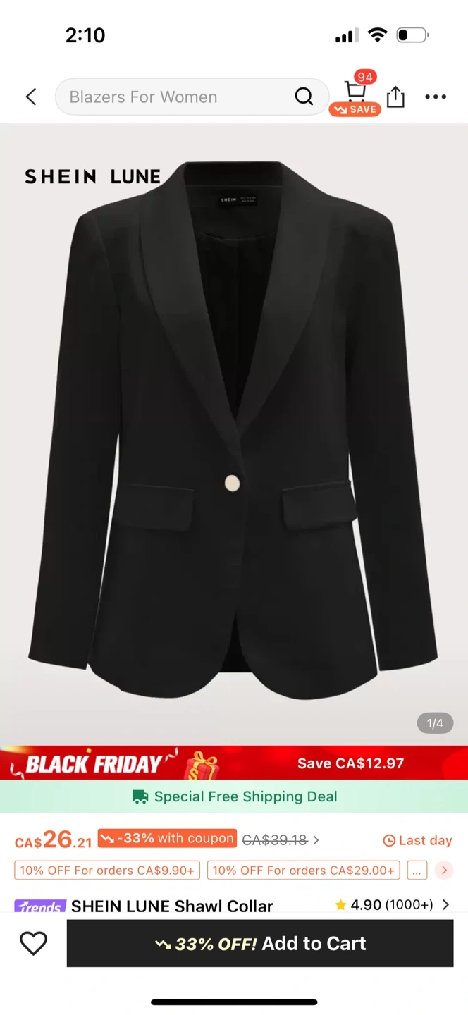 Selling a SHEIN LUNE shawl collar blazer in black. It's in great condition and ready for a new home! It has a classic and stylish look.