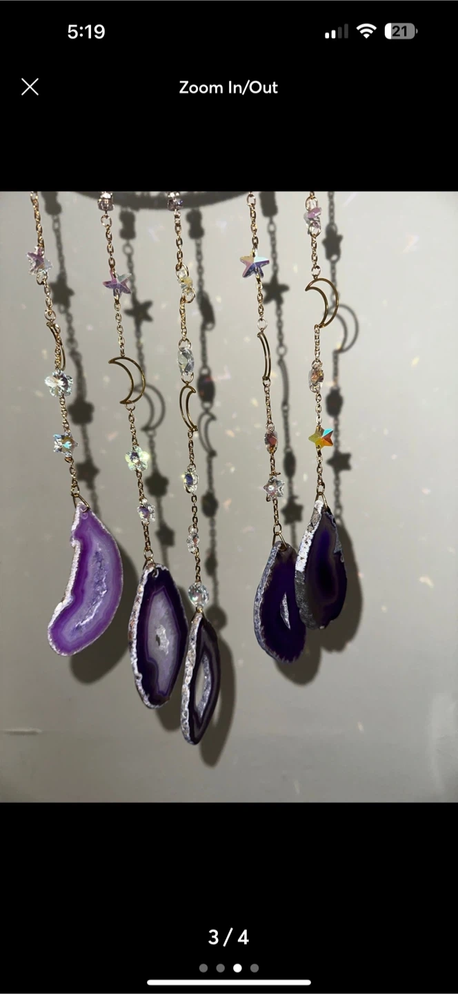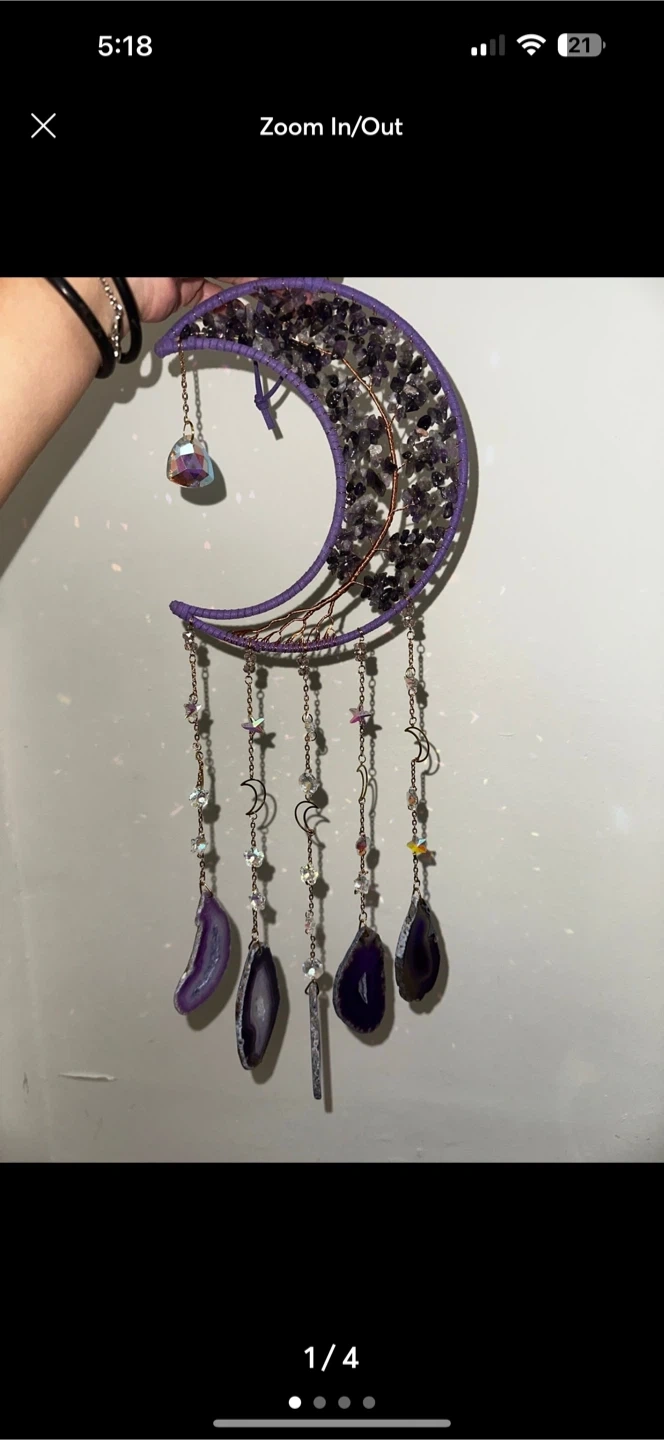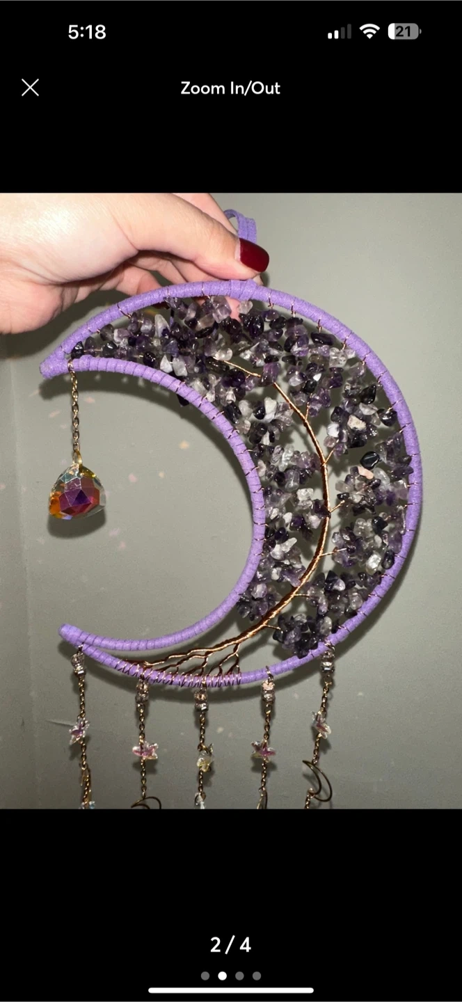 I'm selling a beautiful amethyst crystal moon dream catcher! It features a crescent moon design filled with amethyst crystals and hanging charms. Perfect for adding a touch of magic to any room
