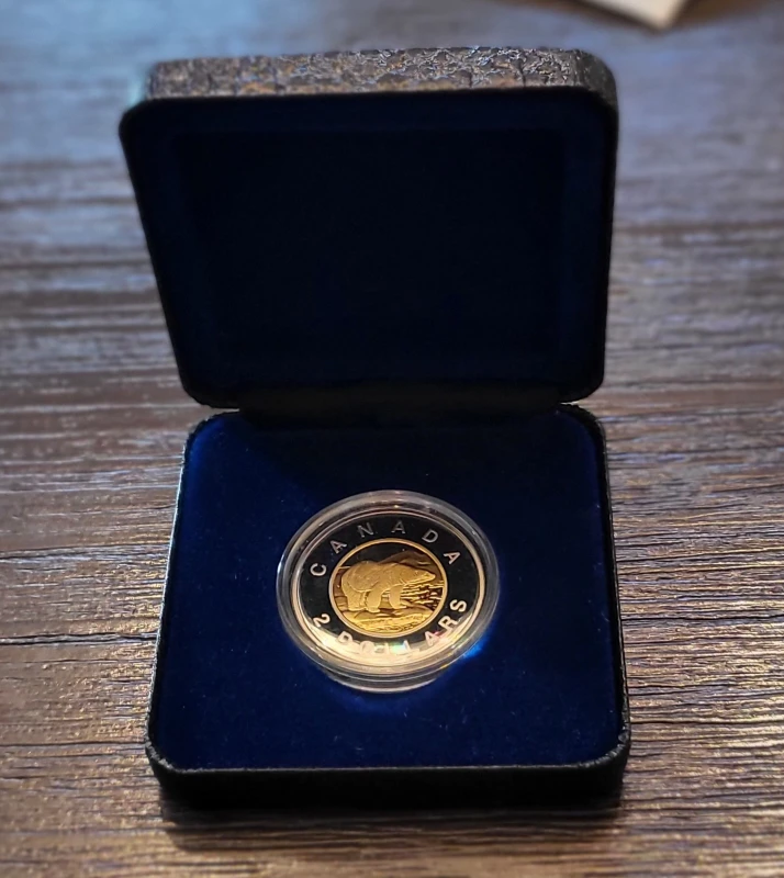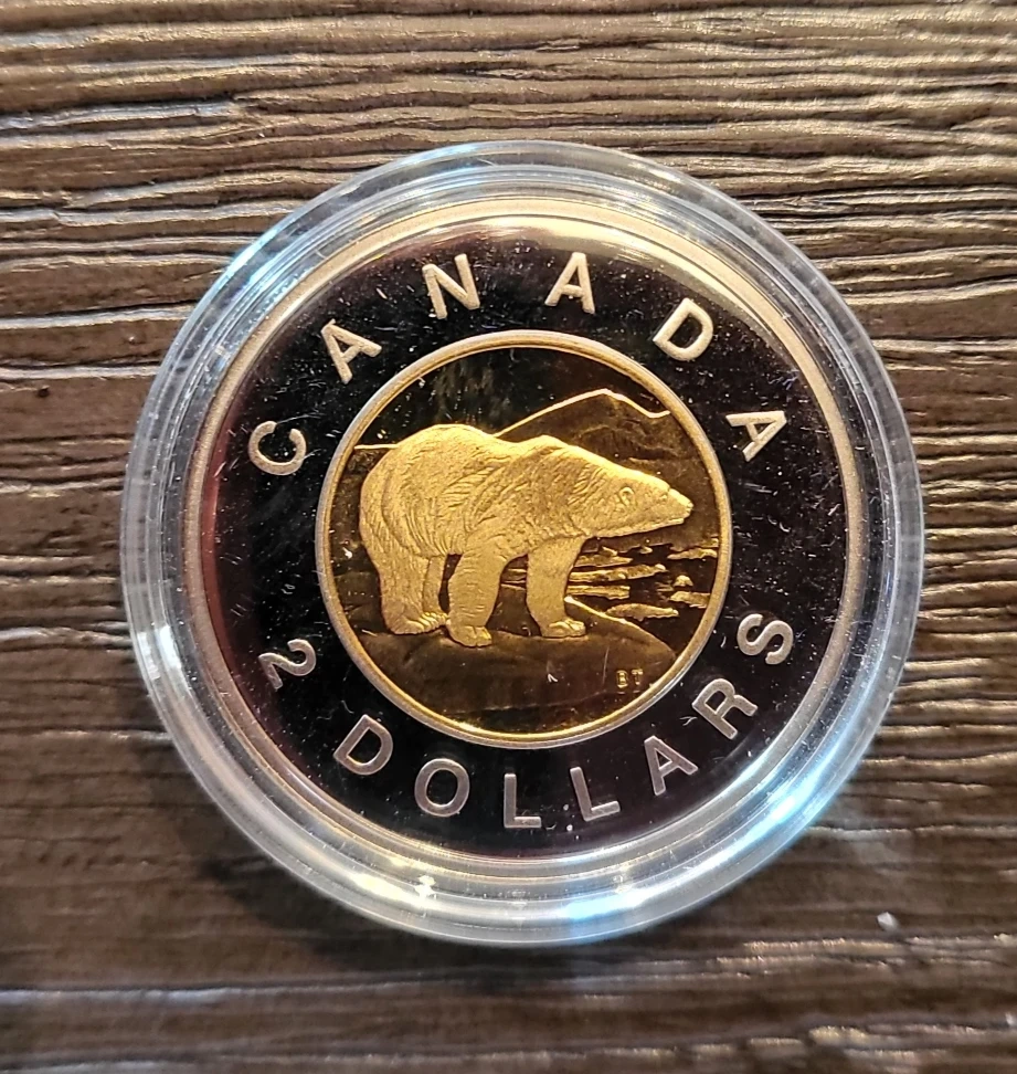 Selling a 1996 Canadian $2.00 coin featuring a polar bear design. It comes in its original box.