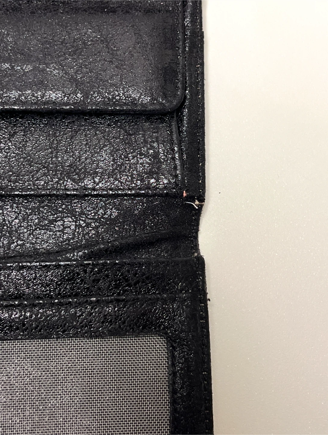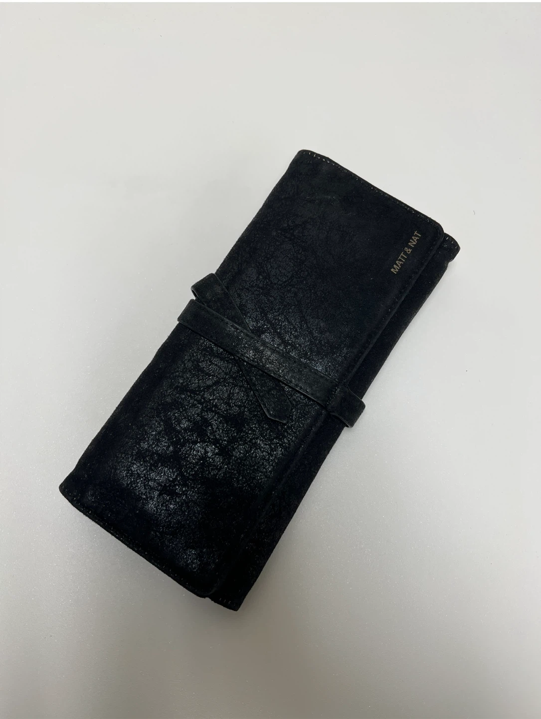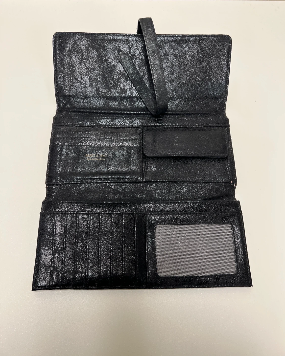 Selling a black Matt & Nat wallet. It has a unique texture and a strap closure. The lining is made with 100% recycled plastic bottles. There is some wear and tear (see photos).