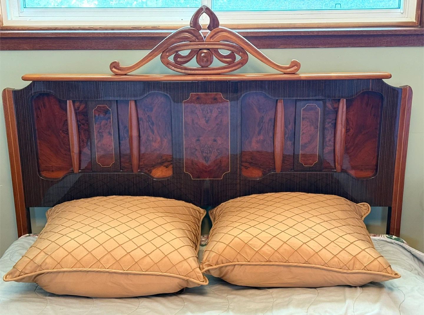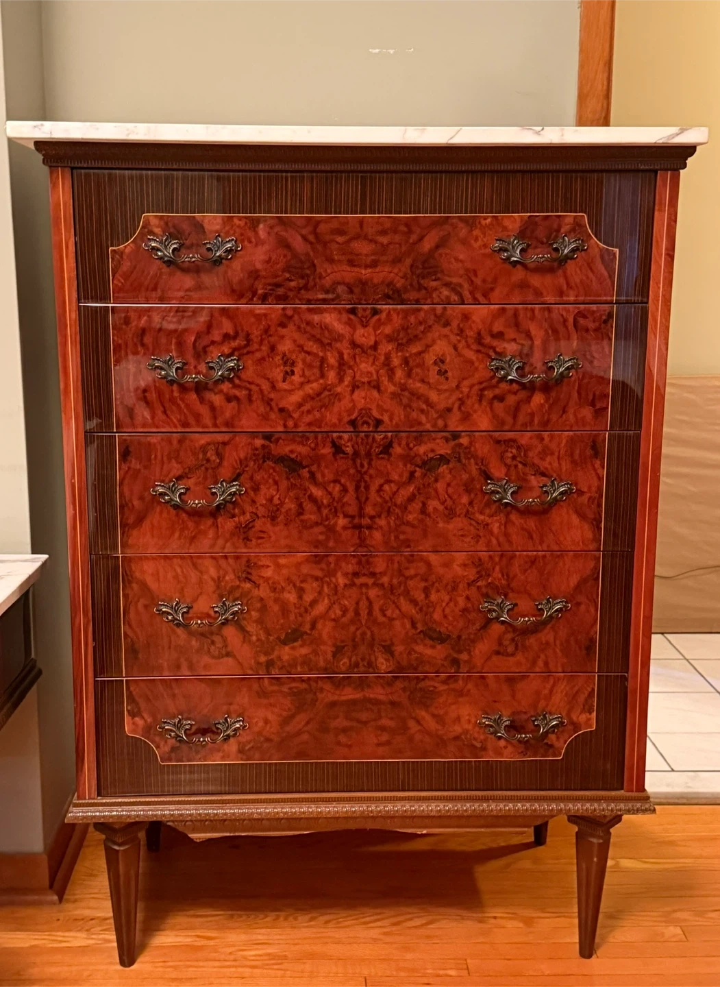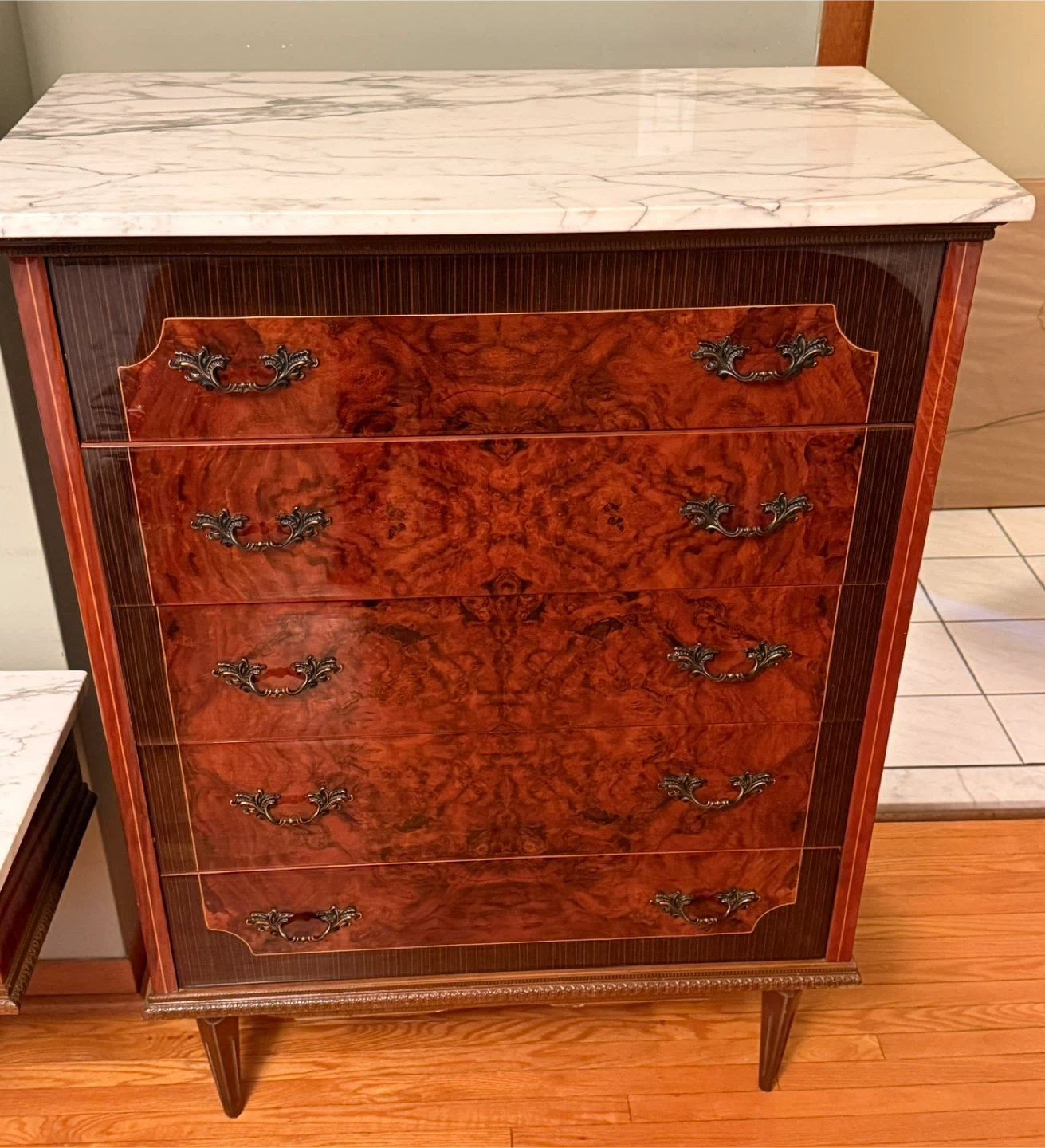 Selling a beautiful antique wood bedroom set. It includes a bed frame, a wardrobe and dresser with a marble top. The set has a unique, classic design and is in good condition for its age. Perfect for adding a touch of vintage charm to your home!