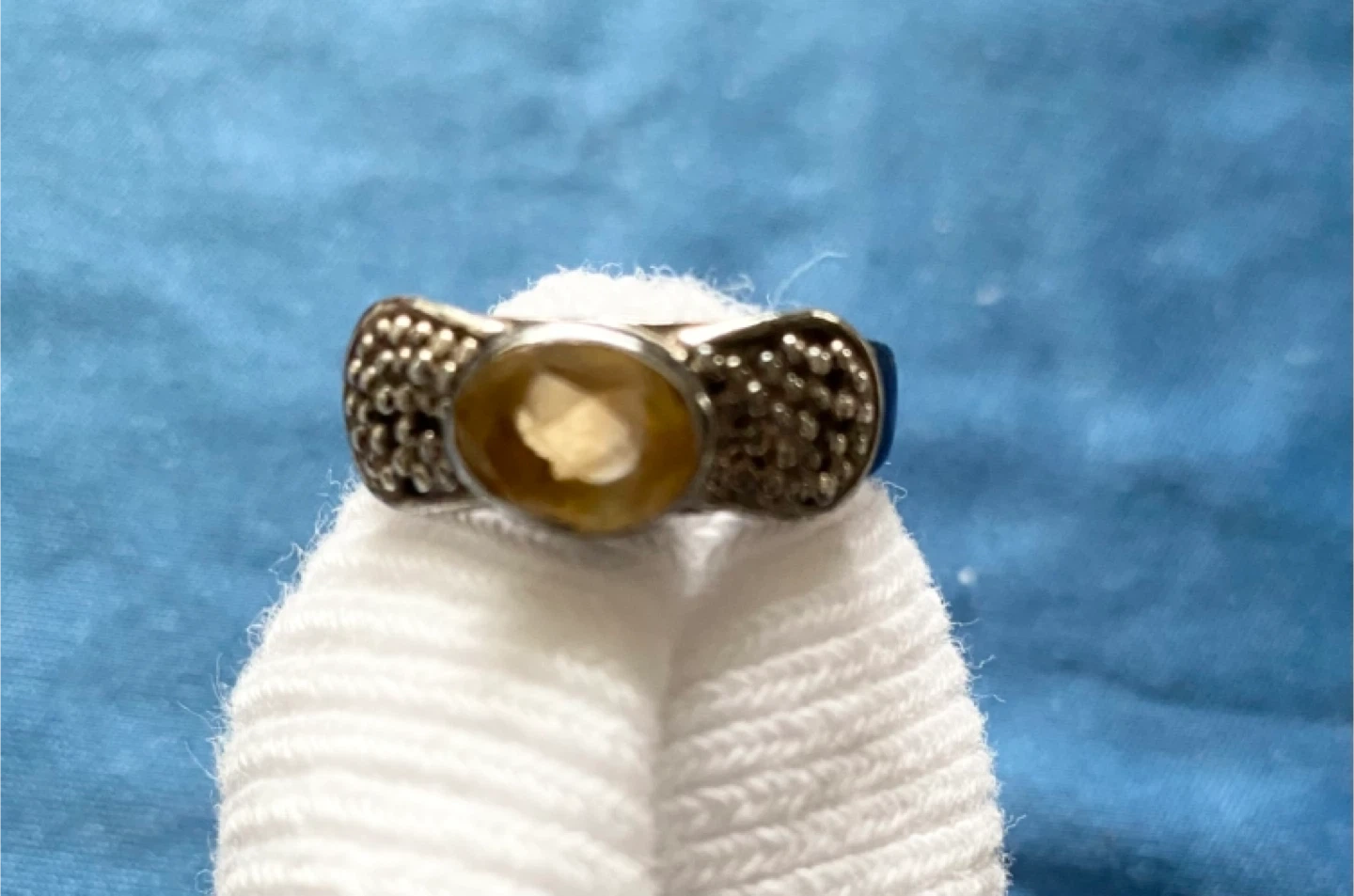 26Selling a vintage silver ring featuring a citrine. The ring has a detailed design on the sides, adding to its charm. It's in good condition and ready for a new home! Size 8.