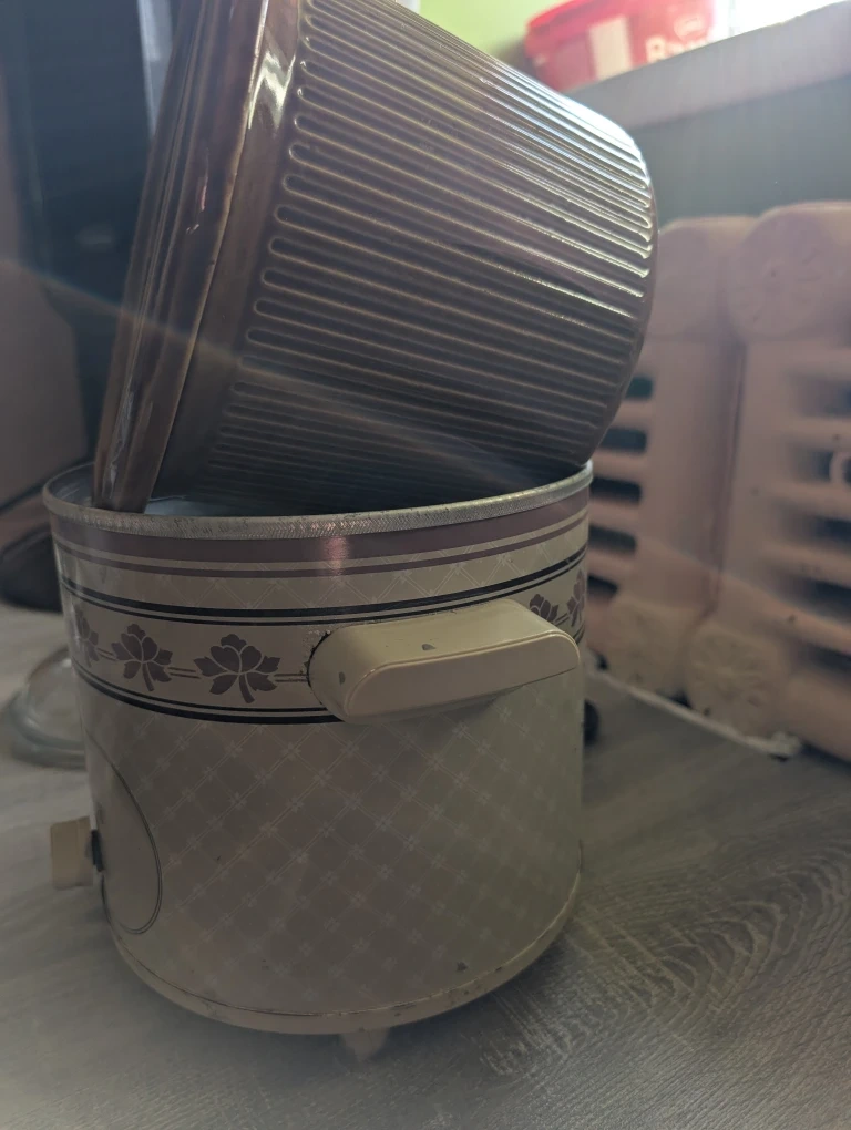 Selling a vintage crock pot, perfect for making stews and slow-cooked meals! It has a lovely floral pattern and comes with a glass lid so you can easily monitor your cooking. It's in good condition and ready for a new home