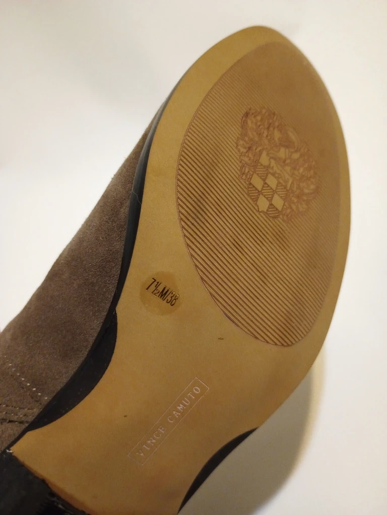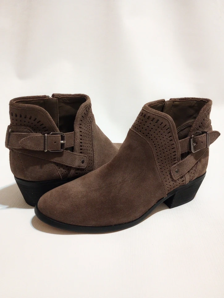 A pair of Vince Camuto brown boots in a seude material. Great condition, no visible scuffs or wear. Features buckles and side zipper.