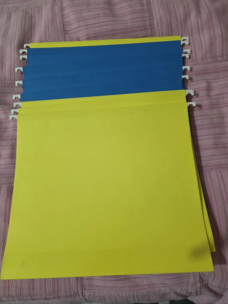 Offering 9 hanging file folders in blue and yellow! They're perfect for organizing your documents and keeping your filing cabinet tidy