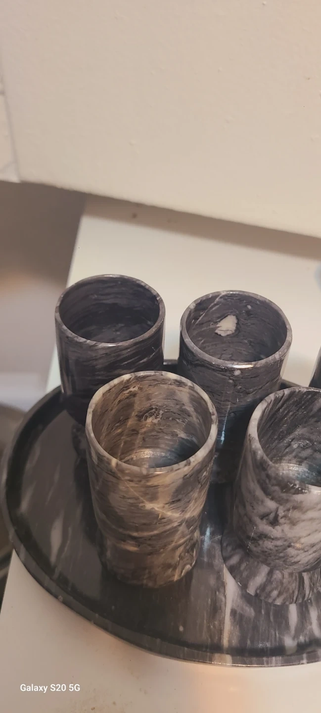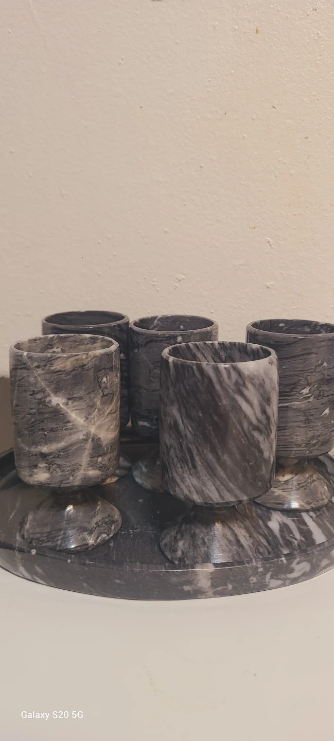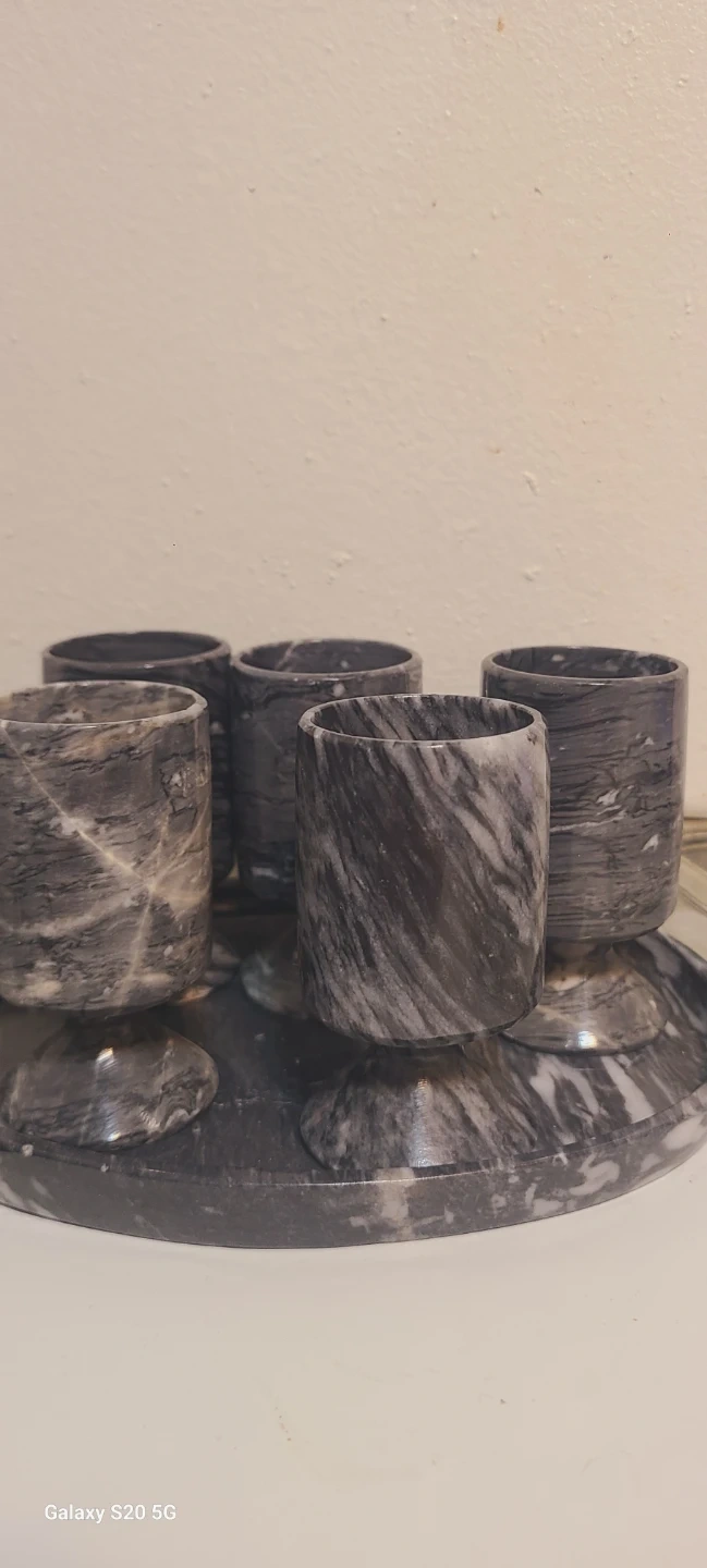 Selling a set of five marble egg cups with a matching tray! They have a lovely grey and white swirl pattern. These are perfect for adding a touch of elegance to your breakfast table or brunch setup