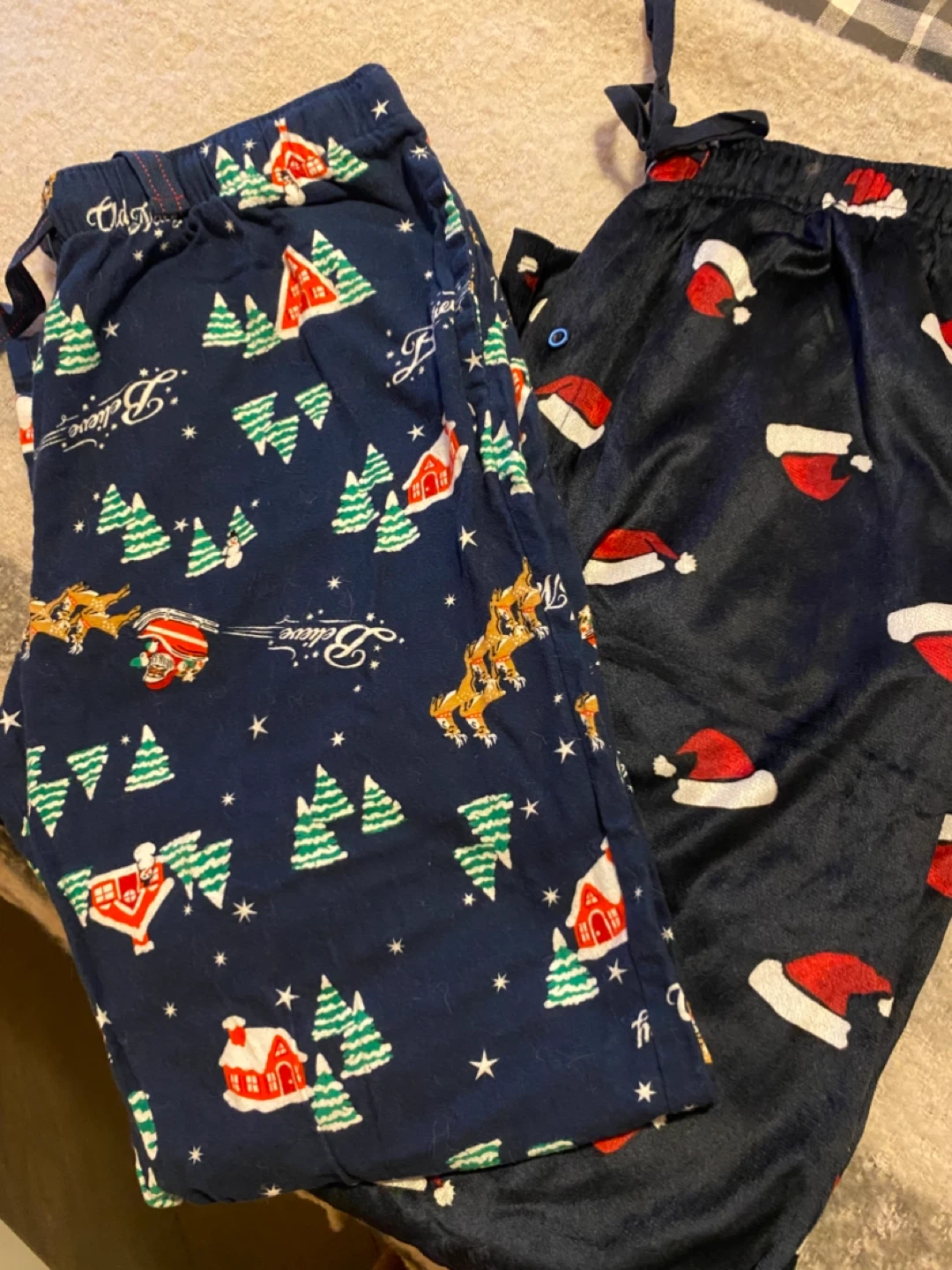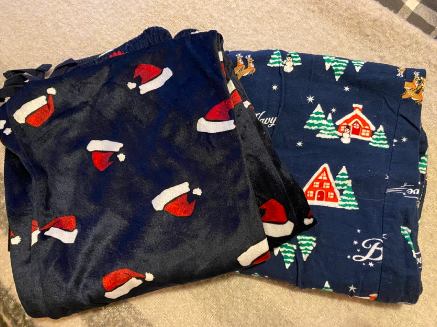 Two pairs of Christmas themed pajama pants. One pair is navy with Christmas trees and houses, and the other is navy with Santa hats. Both are in great condition! Both have pockets! Great for men or ladies 🎄selling as set