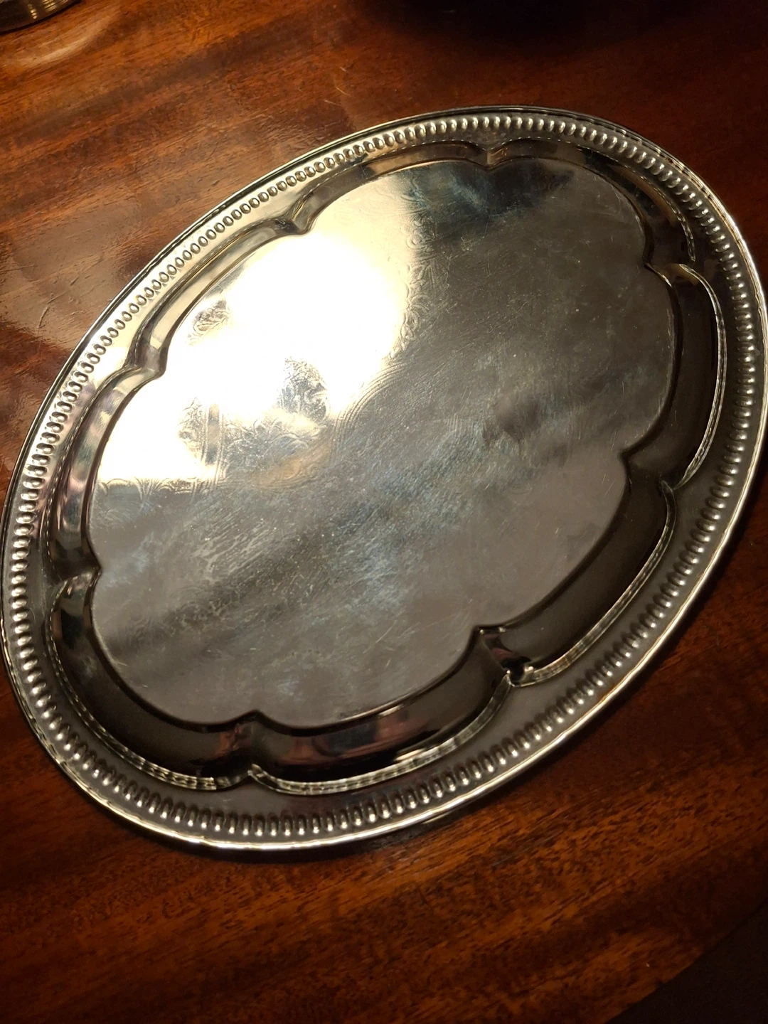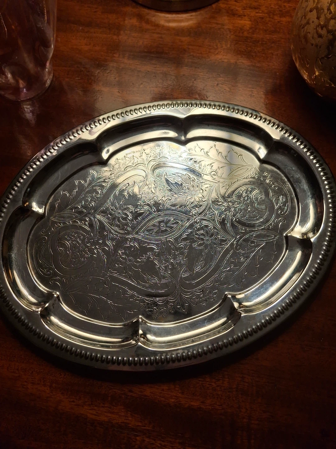 Small, lightweight unmarked silver coloured serving tray with intricate design.