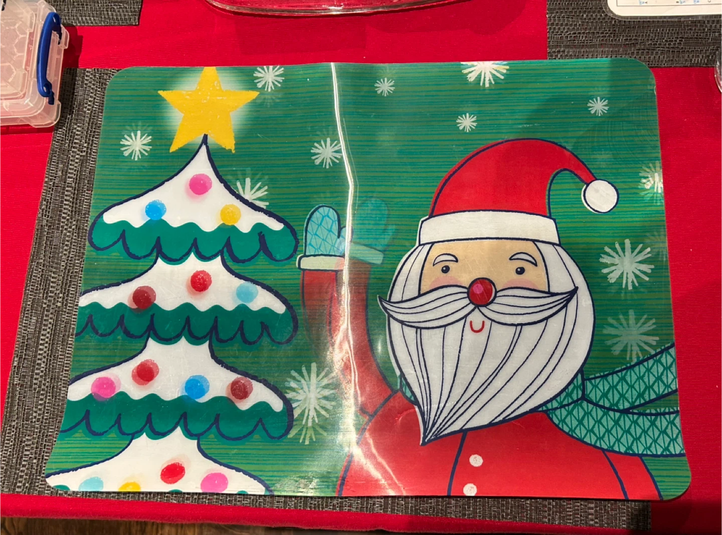 Festive Christmas placemat featuring a cheerful Santa Claus and a decorated Christmas tree! Santa waves when you move placemat. Perfect for adding a touch of holiday spirit to your dining table this season.