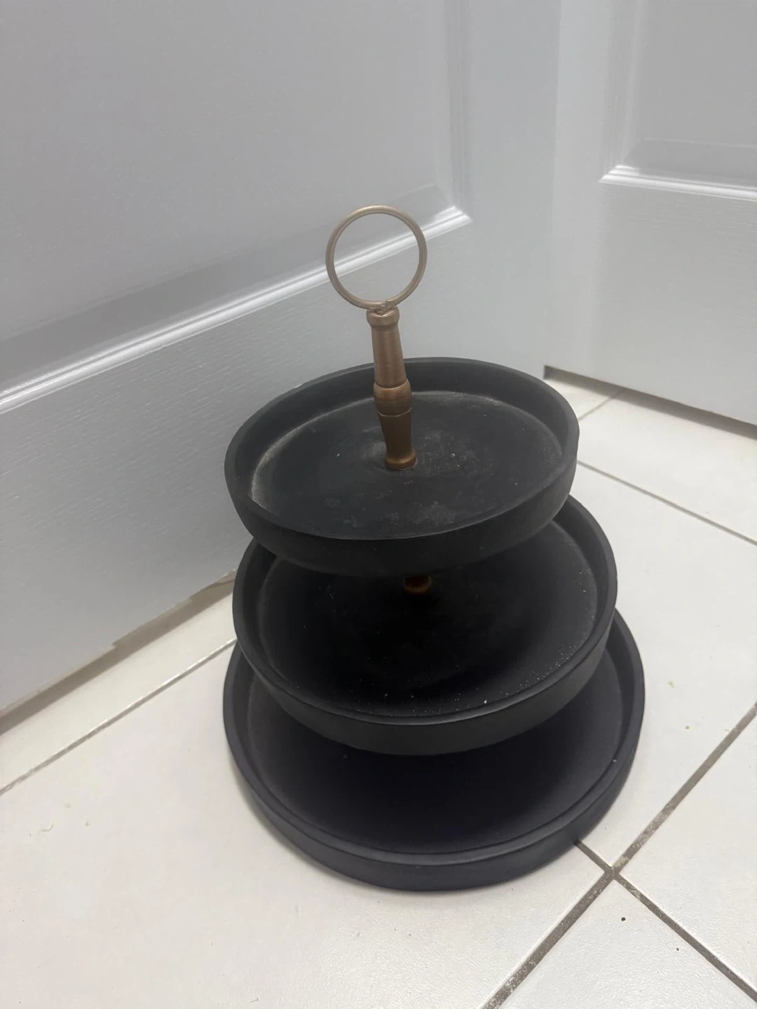 Here's a stylish black tiered serving stand that's perfect for displaying treats, jewelry or appetizers! It's in great condition and would look lovely on any table or countertop