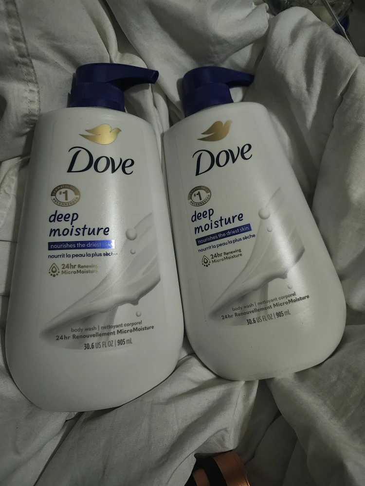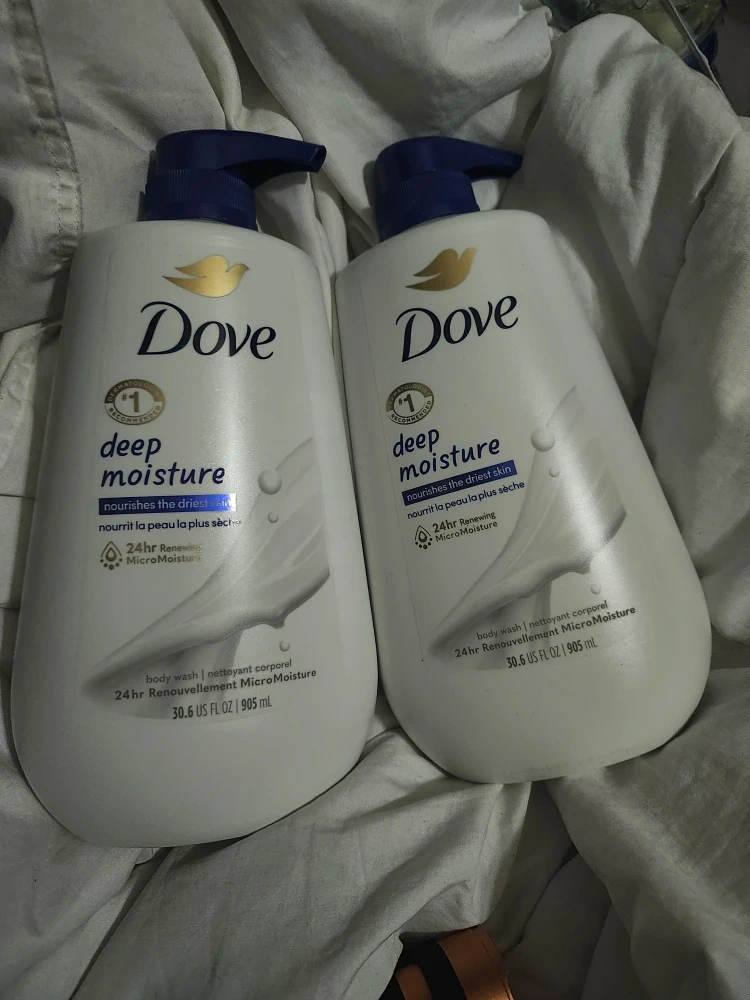 Selling two bottles of Dove Deep Moisture body wash! Each bottle contains 30.6 US fl oz or 905 mL. This body wash nourishes the driest skin and provides 24hr Renewing MicroMoisture for your skin