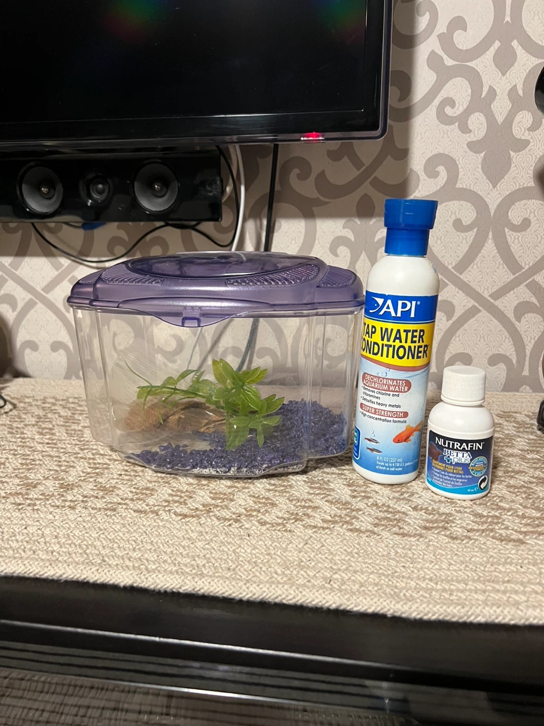 Selling a fish tank! Includes food for a beta fish and Nultrafin for one.