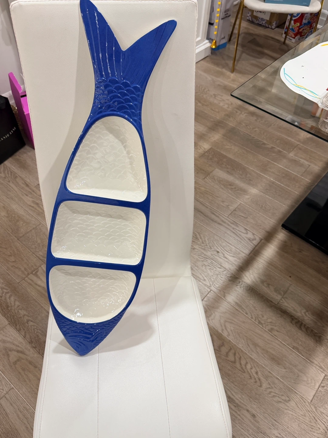 Here's a fun and unique serving dish shaped like a fish! It's a beautiful blue and white colour and features three divided sections, perfect for serving snacks or appetizers at your next get-together.