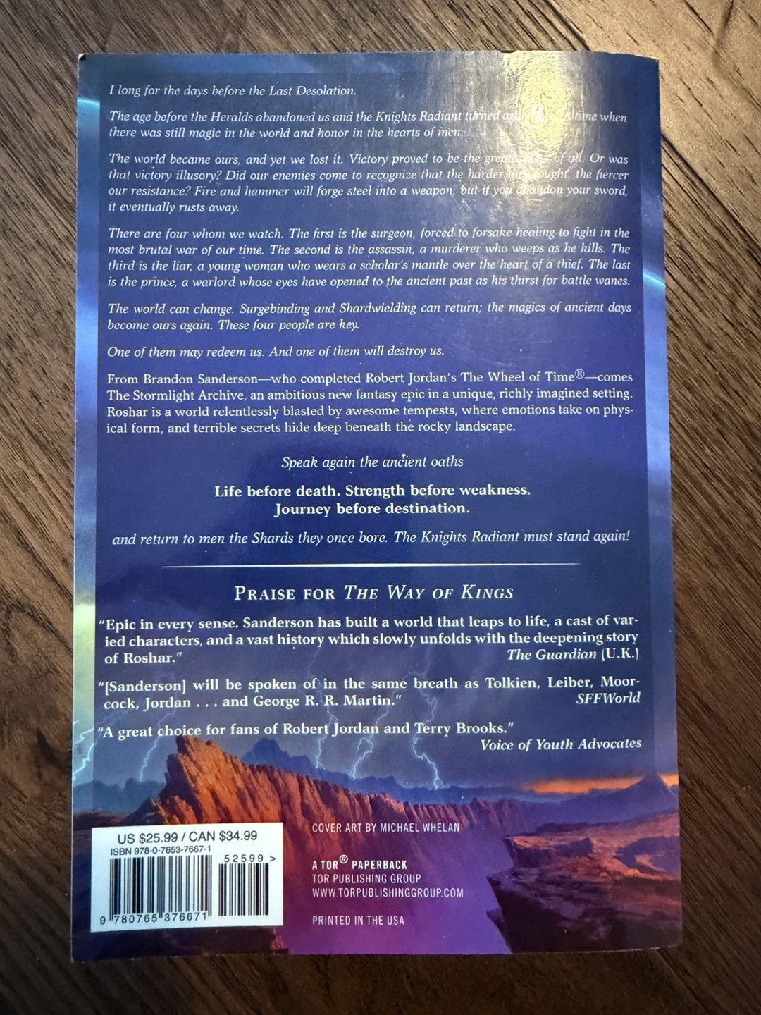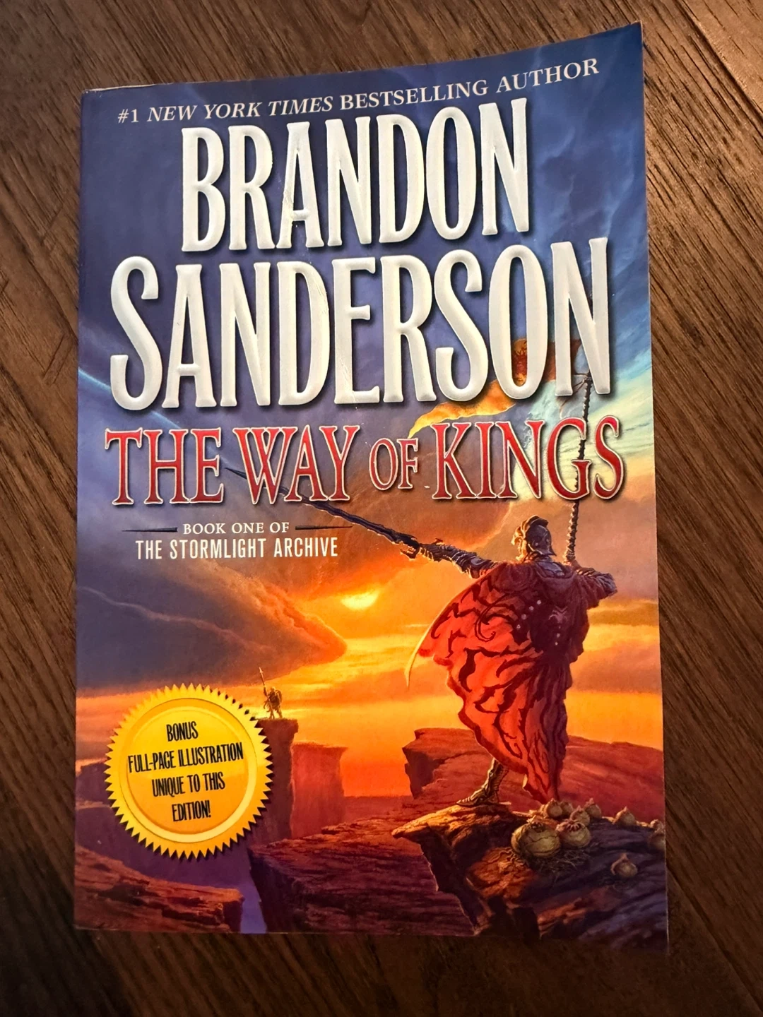 Selling a copy of the bestselling book The Way of Kings by Brandon Sanderson! It's the first book in The Stormlight Archive series. This edition includes a bonus full-page illustration unique to this edition. A great read for fantasy fans!
