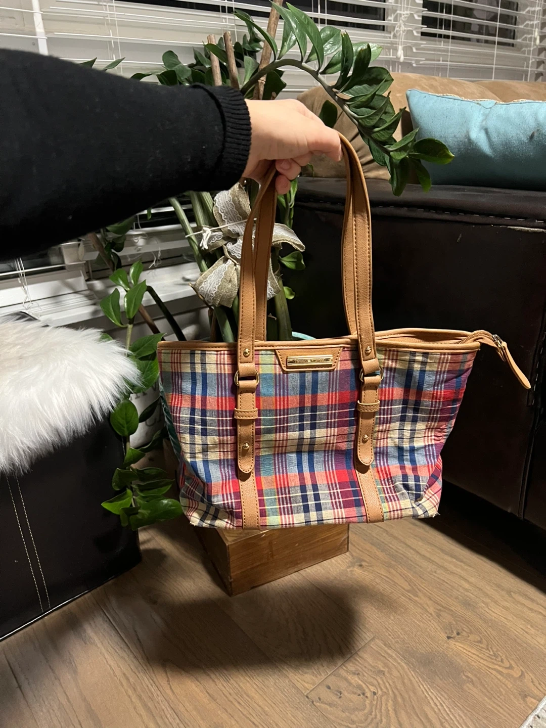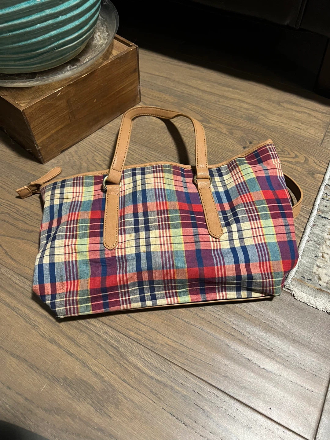Tommy Hilfiger tote bag with a colourful plaid pattern and tan handles. It's in great condition and ready for a new home! The outside has some signs of wear, but the inside is excellent condition. Feel free to ask questions!