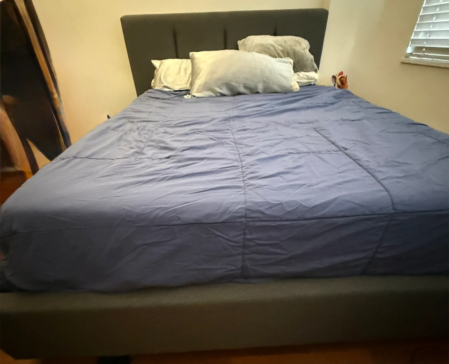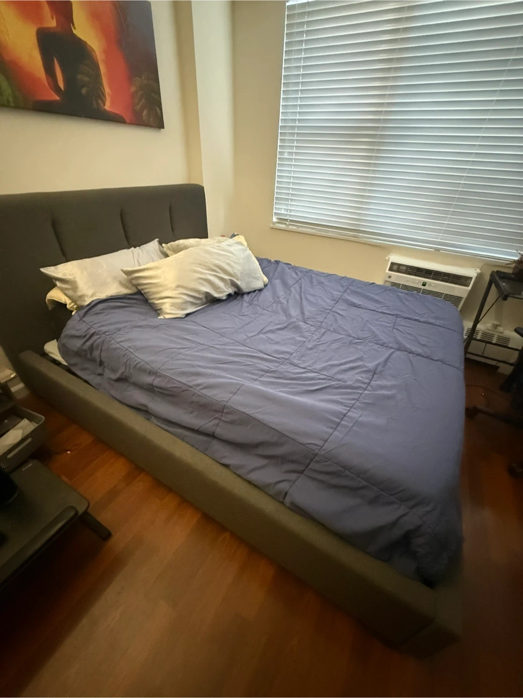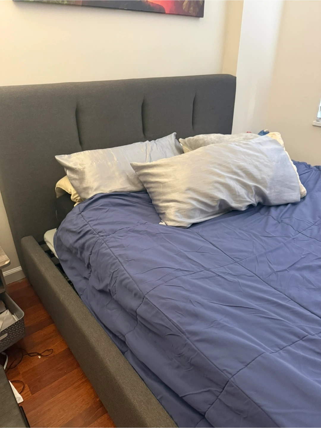 Selling a QUEEN SIZE, gray upholstered platform bed frame with headboard from Raymour and Flanigan . Used for less than a year as we upgraded to a bigger bed frame.