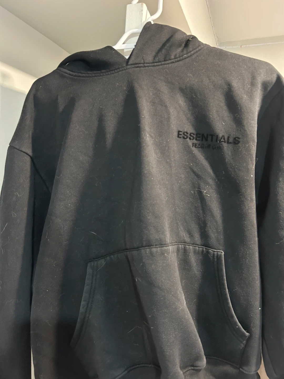 15Selling a black Essentials Fear of God hoodie. It is in good condition and ready for a new home! The hoodie features the 'ESSENTIALS FEAR OF GOD' logo on the back and chest.