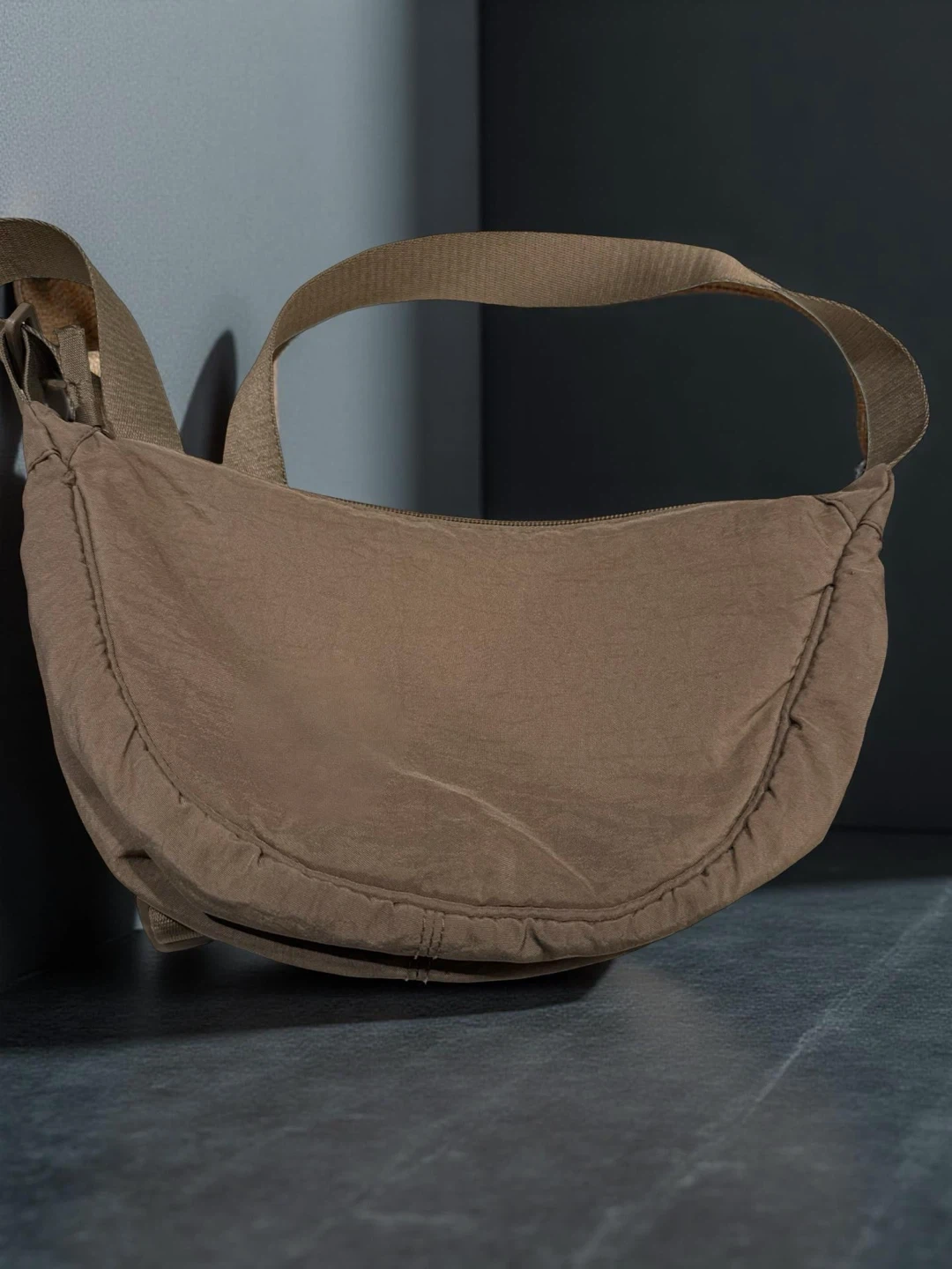 Lightweight crescent-style shoulder bag in a neutral brown colour.