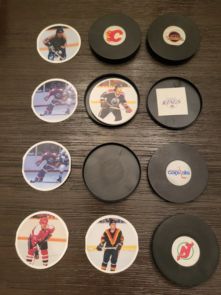 Selling a collection of 1980s NHL Kellogs disc pucks with Hockey Cards inside featuring 5 different teams! Perfect for any hockey fan or collector!