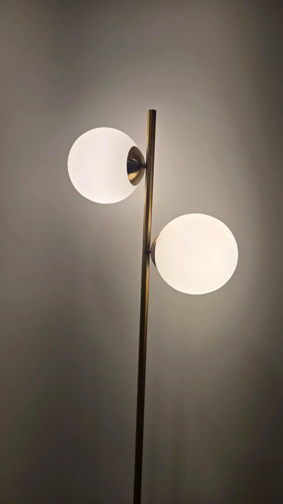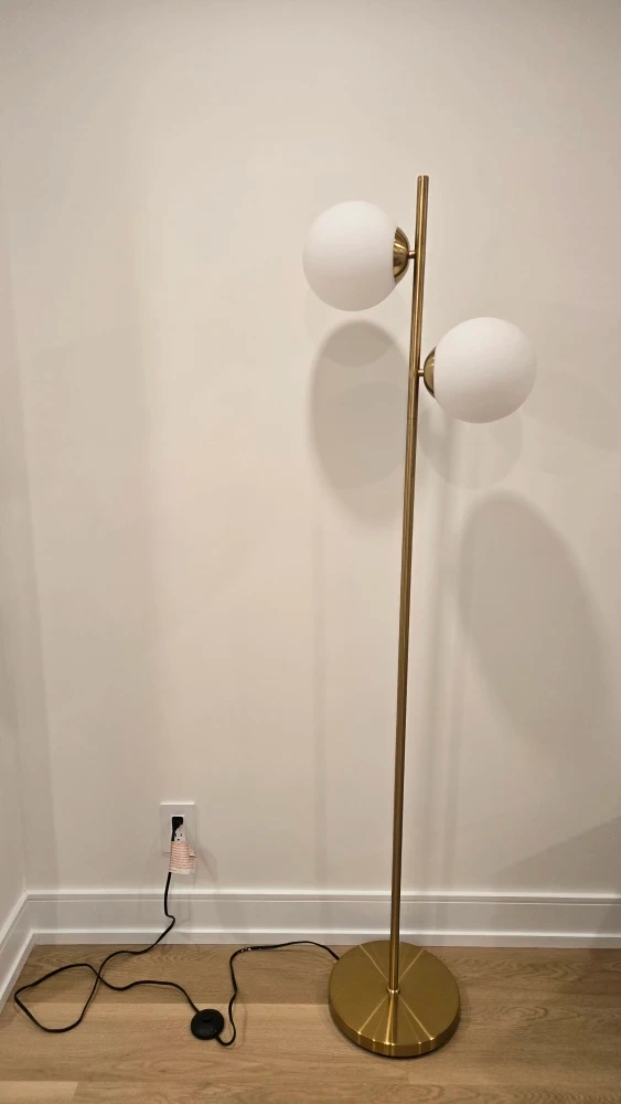 Selling a stylish gold floor lamp featuring double globe lights! It adds a touch of modern elegance to any room. The lamp is in great condition and provides a warm, ambient glow. Perfect for living rooms, bedrooms, or offices!
