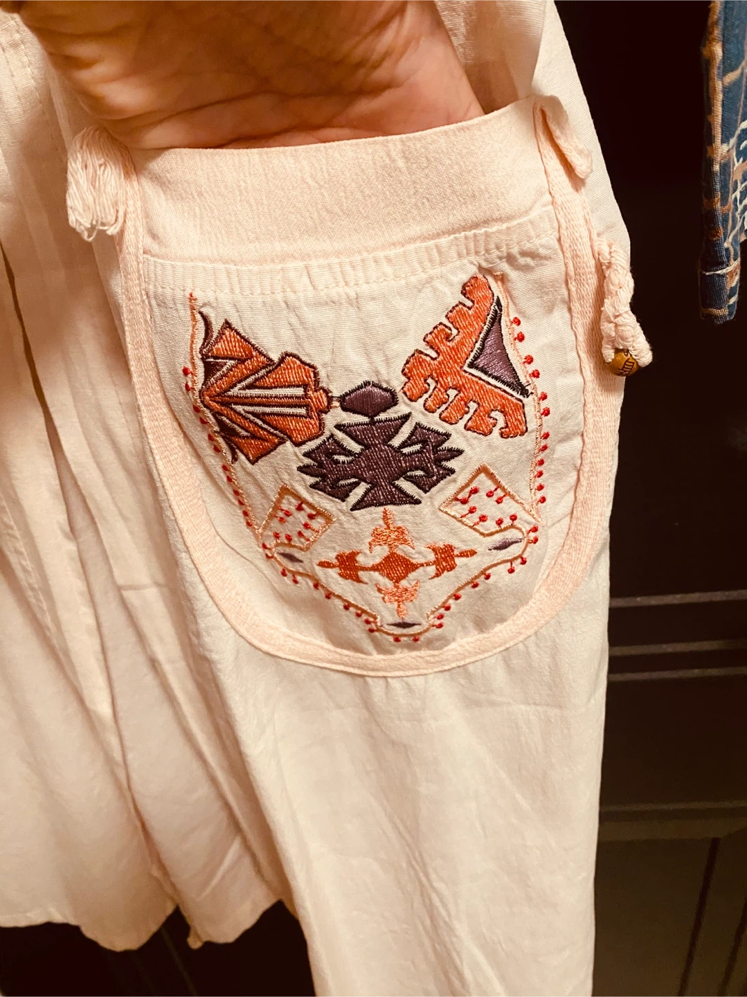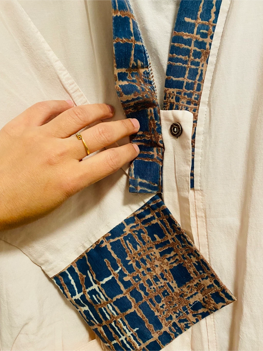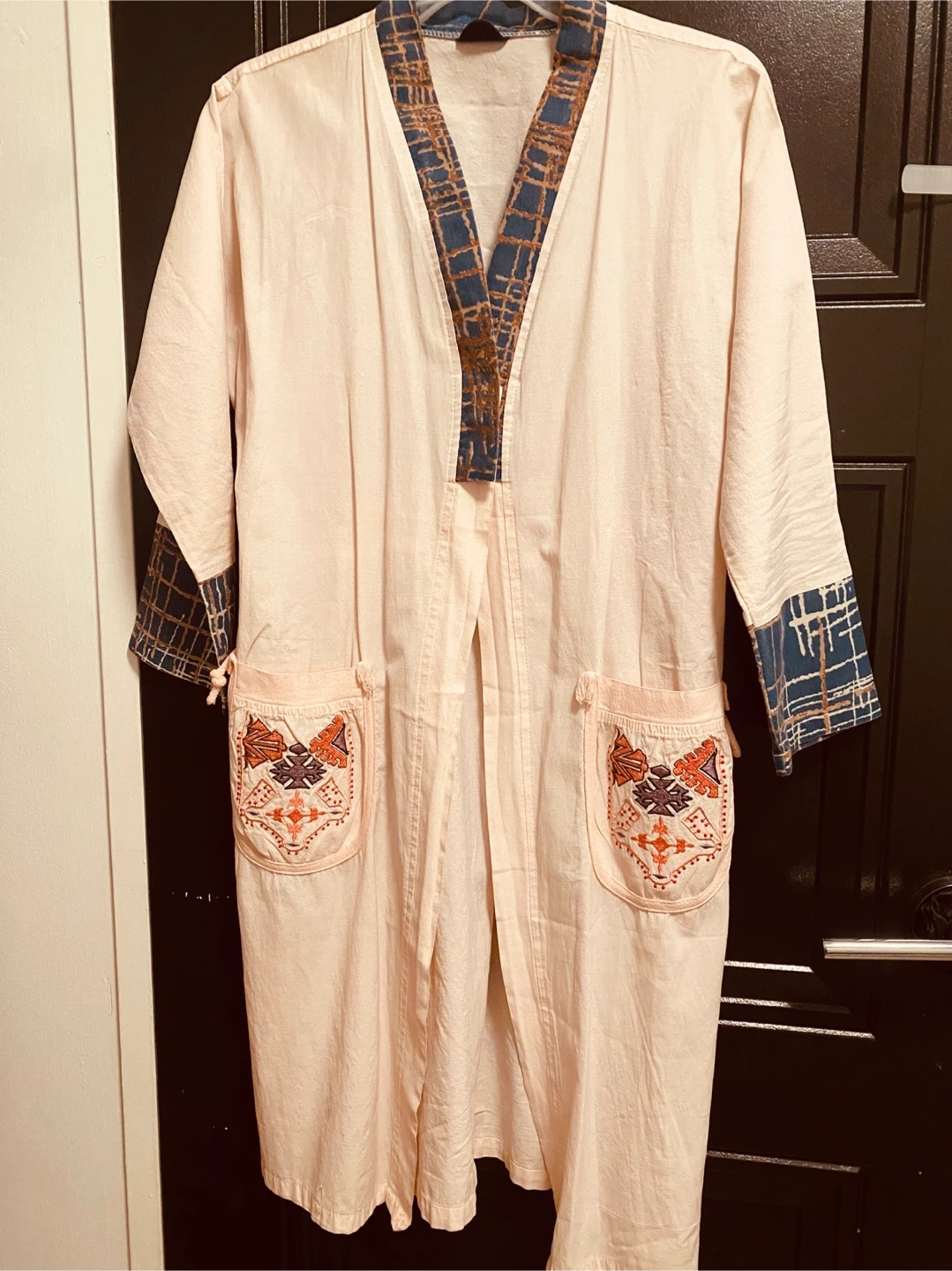 This unique, used Zagros A.M. robe/ cardigan is a beautiful addition to any wardrobe, featuring a stylish design with eye-catching details. This piece is size medium with an eye-catching blue and brown detailed pattern. It also includes some embroidered pockets at the front.