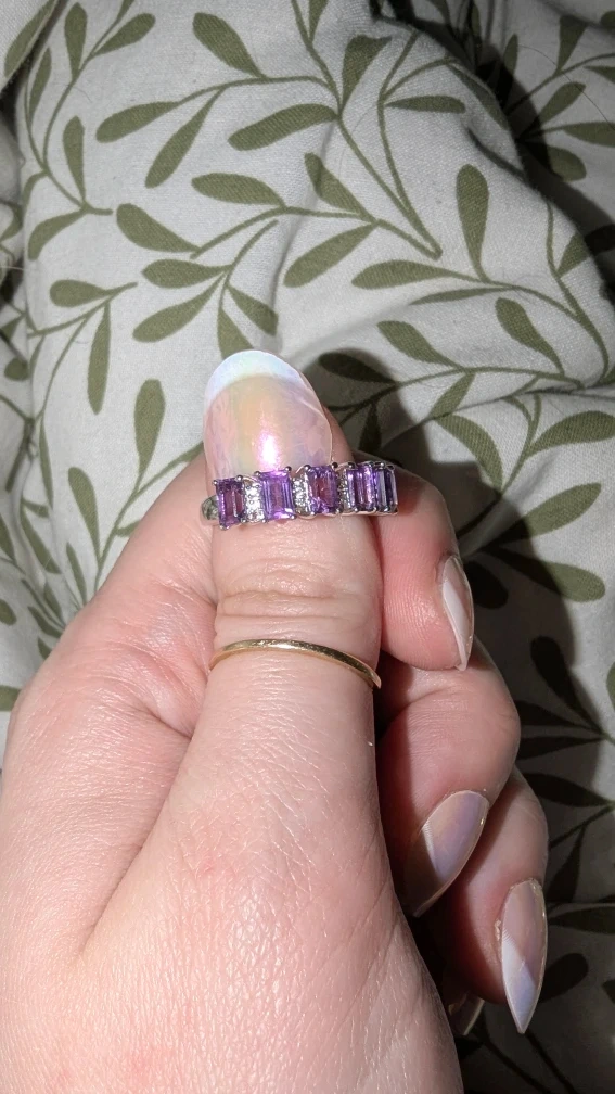Here's a beautiful genuine amethyst and cz ring! It's made of 925 sterling silver and features a row of vibrant amethyst stones interspersed with sparkling cz diamonds. The ring is stamped with '925'.