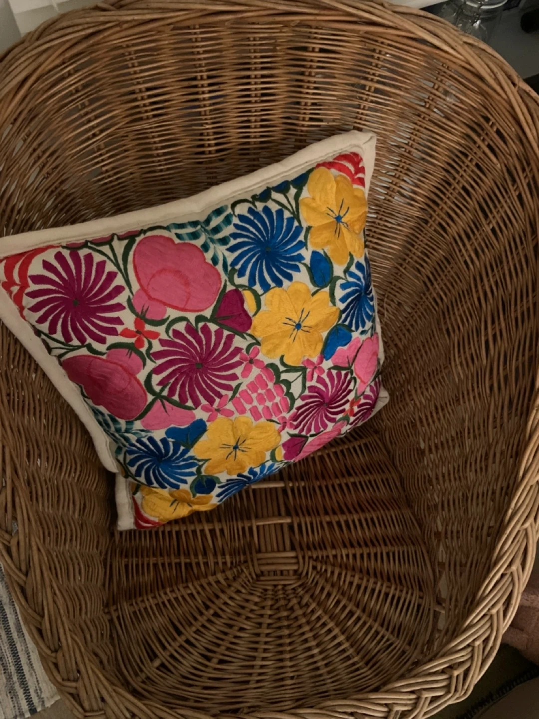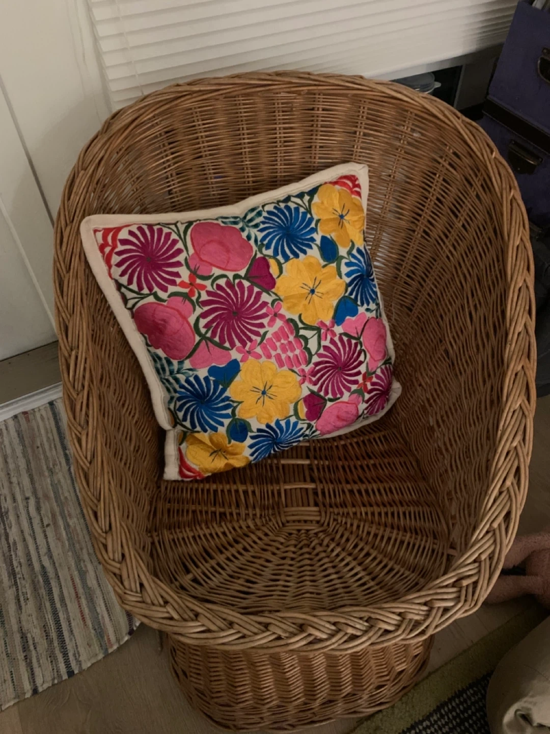 Giving this away! A sweet little rattan/wicker chair with a colourful throw pillow from Mexico.