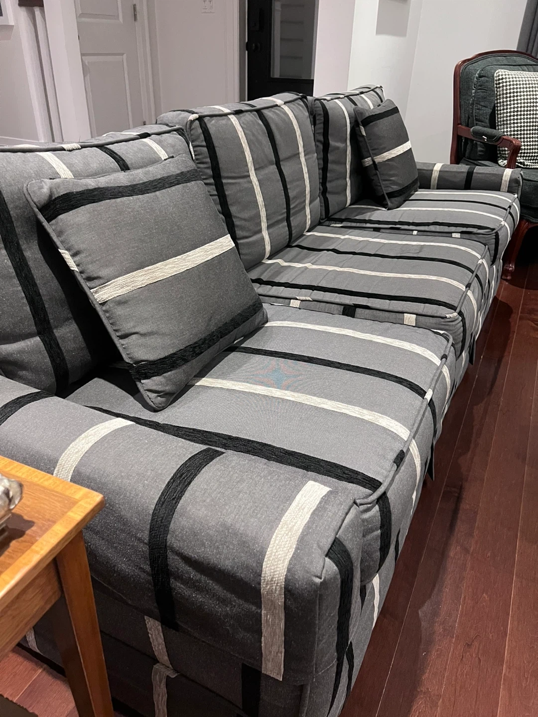 Selling a comfortable sofa with a stylish striped pattern in grey, black, and white. It's perfect for adding a modern touch to your living room. The sofa comes with matching throw cushions for extra comfort.