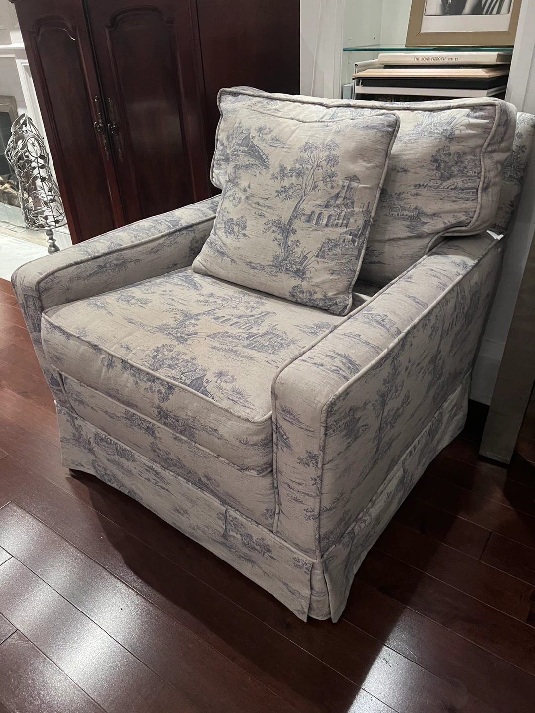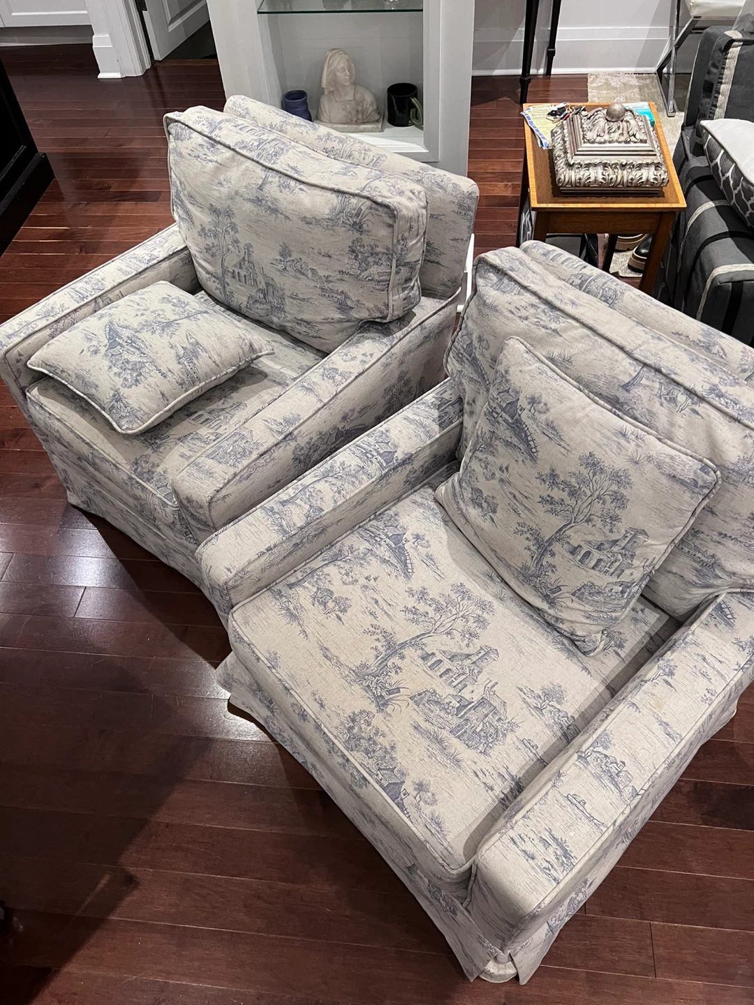 Selling two comfy armchairs with matching throw pillows! The chairs have a lovely pattern and look great in any living room or den. It's in good condition and ready for a new home. Casters on the bottom of both chairs. Pick up only.