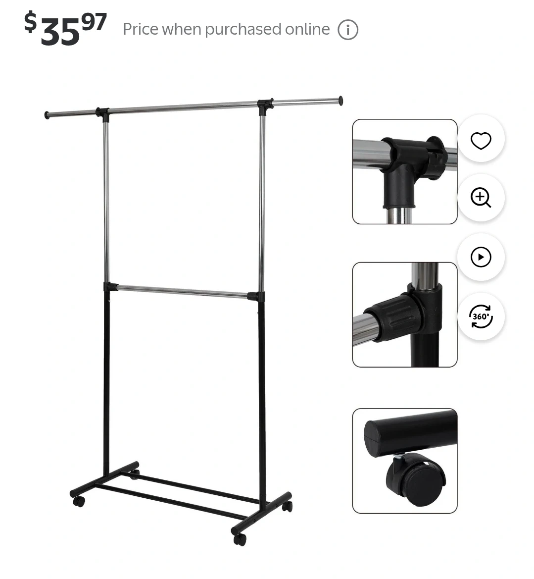 An adjustable double rod clothing rack. It's expandable from 36.2 inches to 62 inches, and stands 70.75 inches tall. It's perfect for maximizing your closet space or creating a temporary wardrobe!