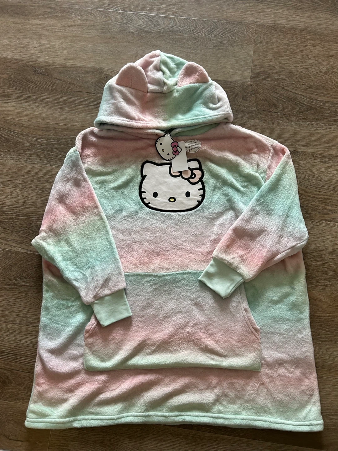 Brand new Hello Kitty snuggle lounge hoodie! It's super soft and cozy, perfect for lounging around the house. The hoodie features a cute Hello Kitty design on the front and ears on the hood.