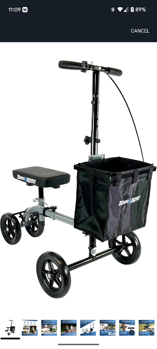 Selling a KneeRover knee walker. It's in great condition and ready to help you get around while recovering from a leg injury. It comes with a handy basket for carrying your essentials. This was used for about a month only.