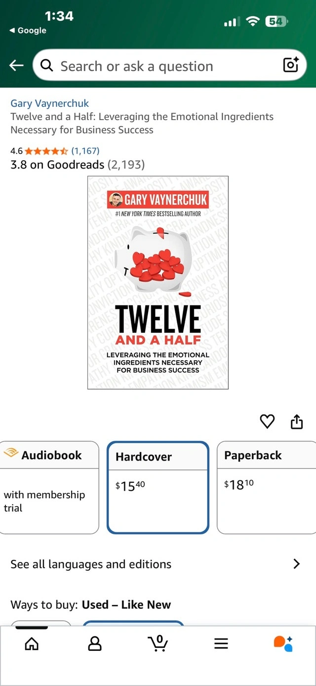 I'm selling Gary Vaynerchuk's 'Twelve and a Half: Leveraging the Emotional Ingredients Necessary for Business Success' in hardcover! This book is in new condition, ready to inspire its next reader with insights on business and emotional intelligence.