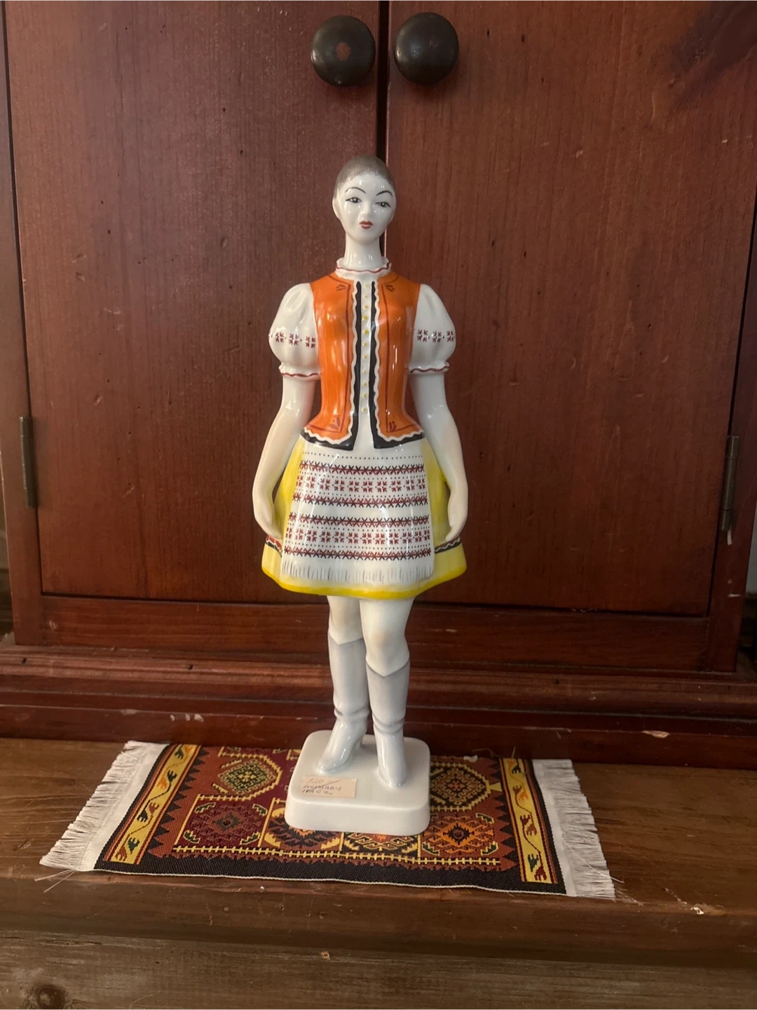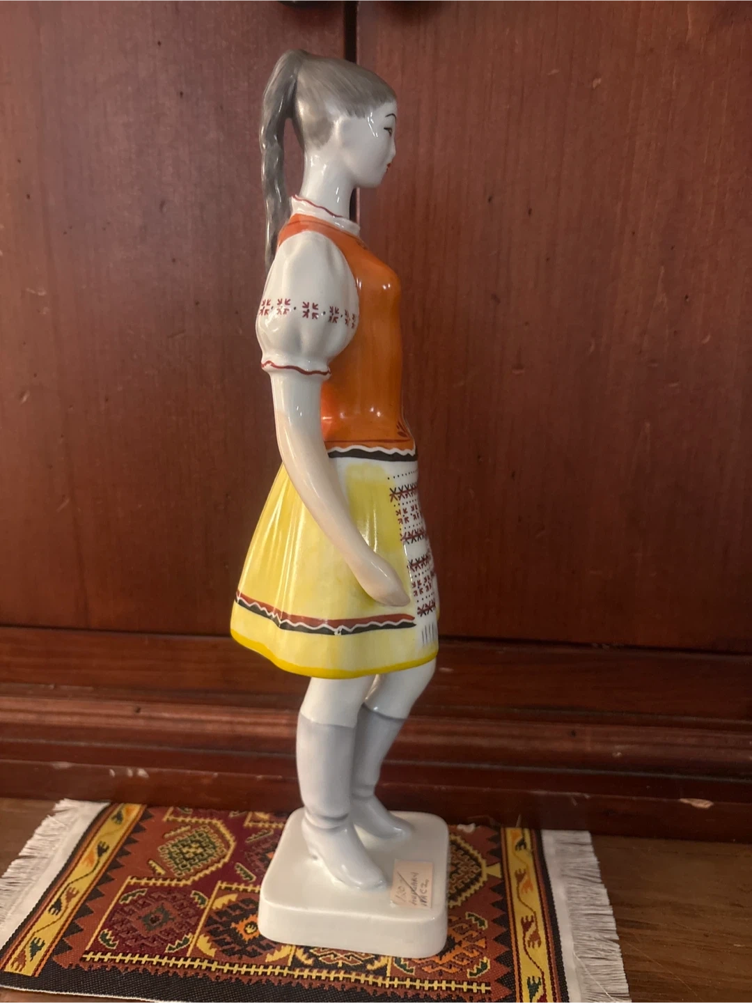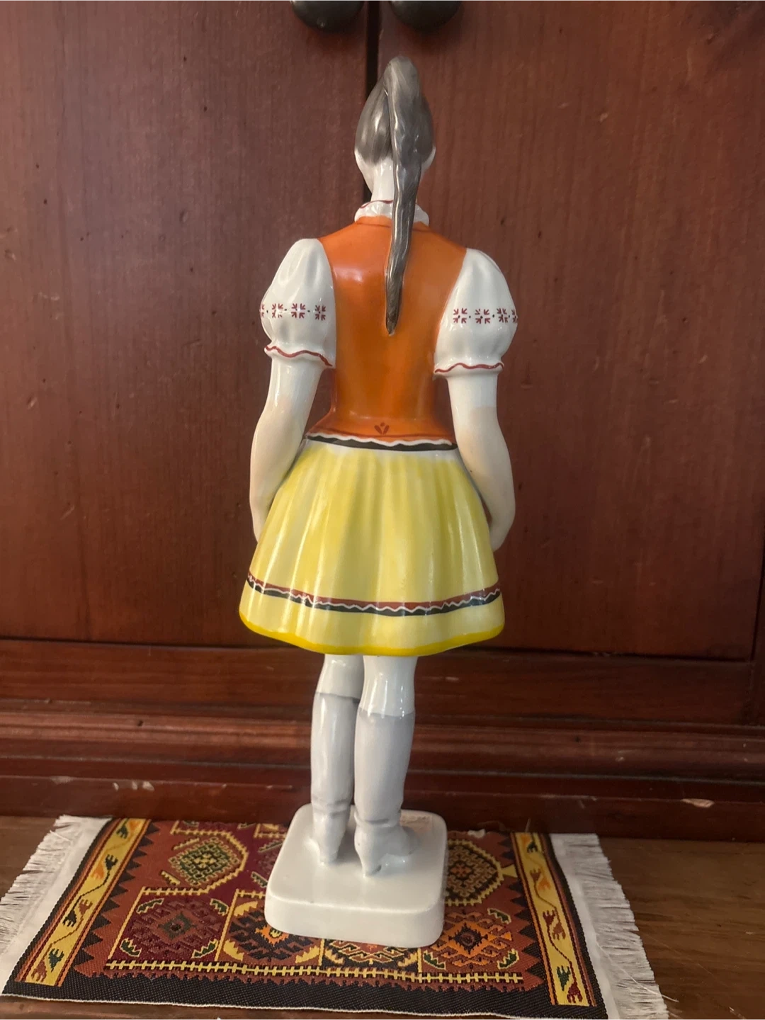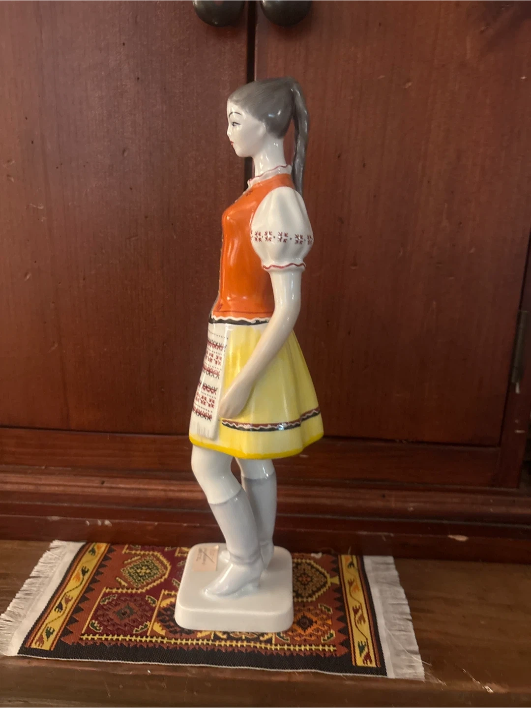 This is a lovely vintage porcelain figurine of a woman in traditional dress. It's in great shape and would make a beautiful addition to any collection or home decor