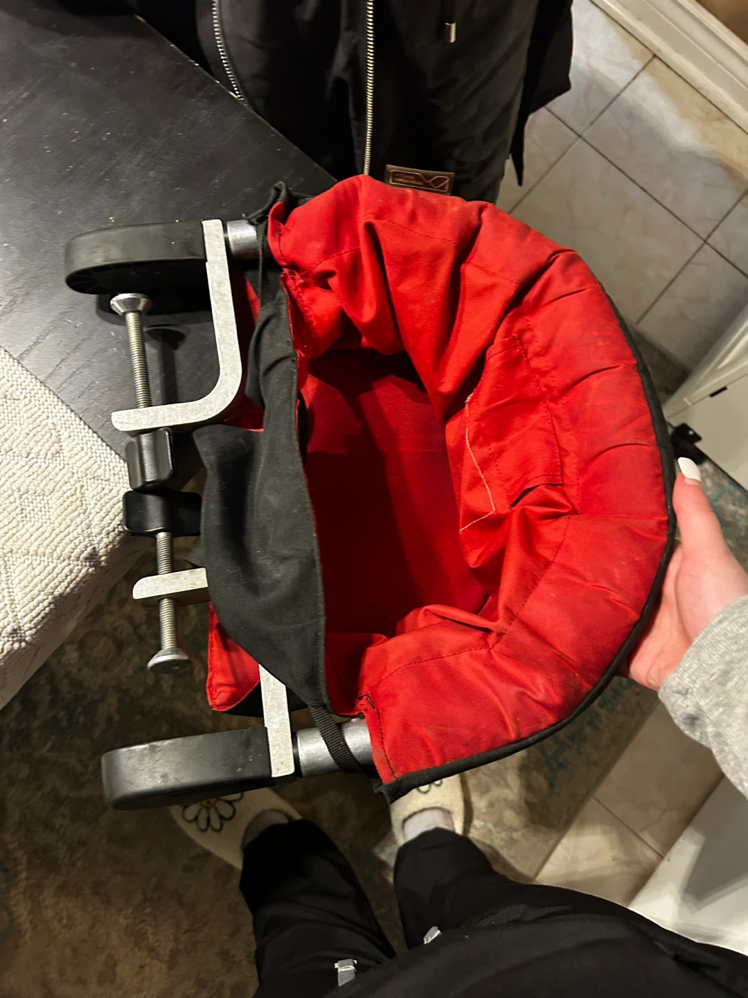a Mountain Buggy Pod clip-on high chair! It's in great shape and super convenient for travel or small spaces. The red and black colour is stylish and practical. It clips easily onto most tables, making mealtime a breeze wherever you are #freecycle