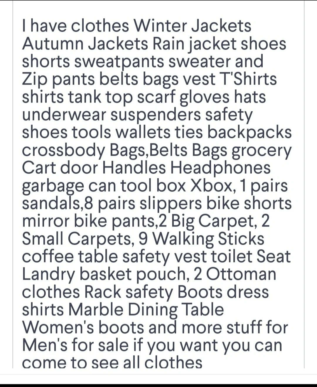 I have and Winter Jackets For Men's and Boys for sale different prices different colors and different Brands if you want you can come to see all clothes and jackets only cash.