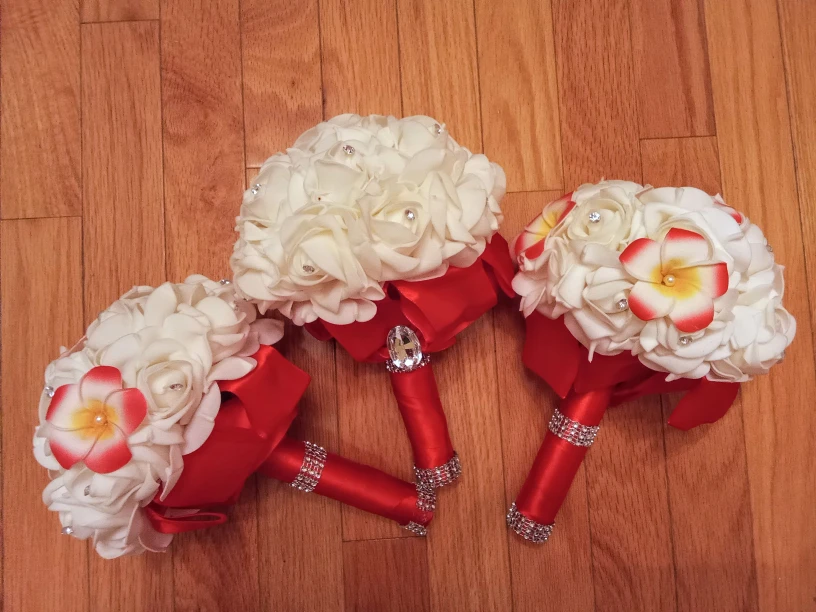 Selling a set of three wedding flower bouquets. They feature white roses with red accents and rhinestone details. Perfect for a wedding or special event!