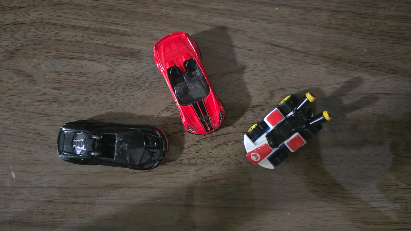 Selling a set of three toy cars. Includes a black car, a red car, and a Mario Kart themed car. They're in great condition and ready for a new home!