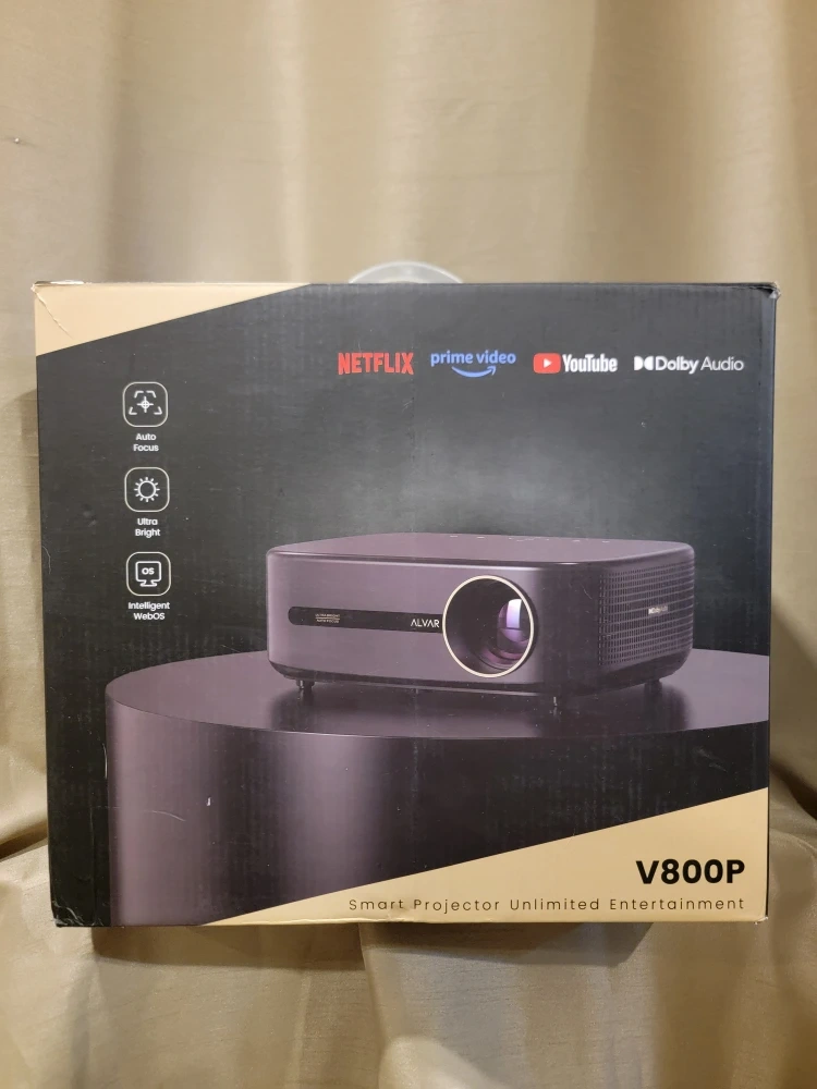 Alvar V800P smart projector. Box includes projector, manual, hdmi cable, cleaning cloth/swaps and power cord/adapter.