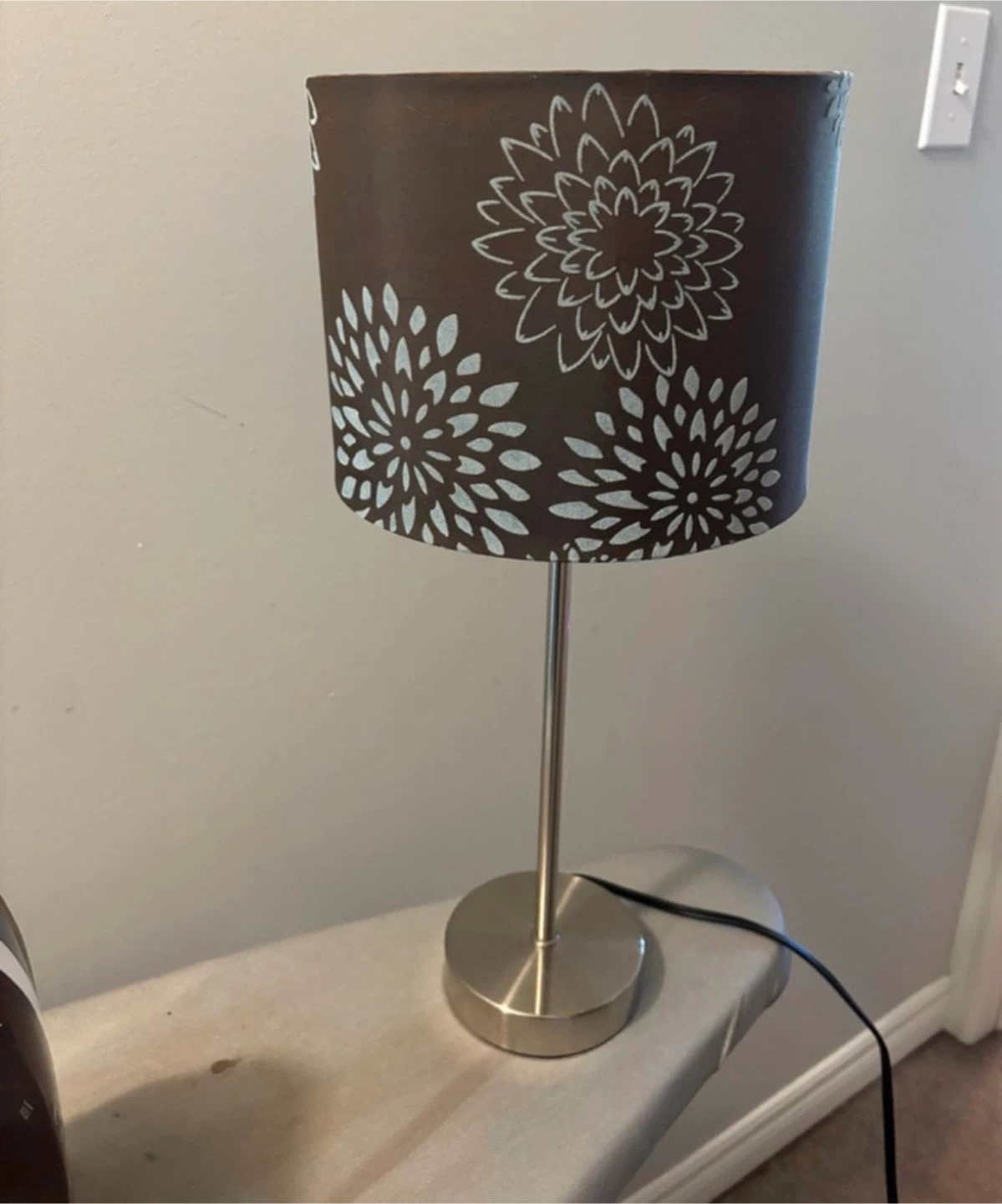 Here's a lovely table lamp with a brown shade and a floral design. It has a silver-coloured stand and base. It would be a nice addition to any room! 2 Available