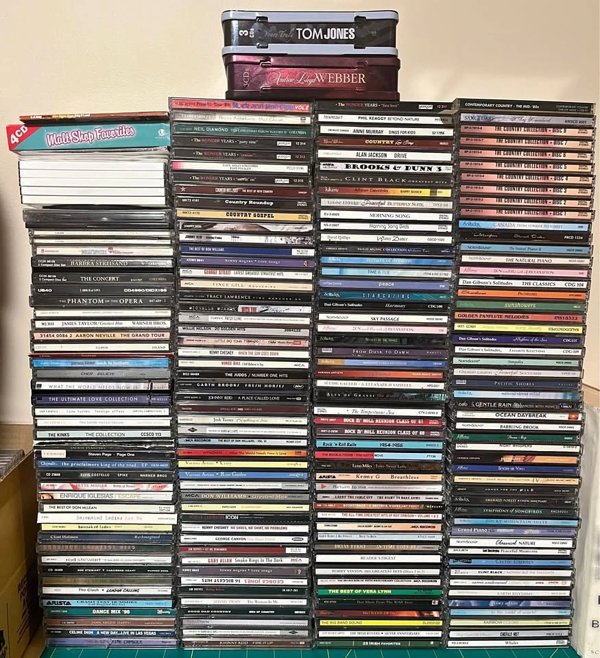 Downsizing a big music library. You get over 190 standard CDs in jewel cases PLUS the box sets/tins and loose CDs shown (these extras were not counted in the 190). Great for collectors, resellers, or anyone building a library.