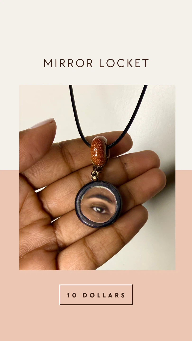 Selling a unique handmade mirror locket! It features a circular mirror pendant with a black frame and a brown natural stone bead on a black cord. Made with lots of love and care.