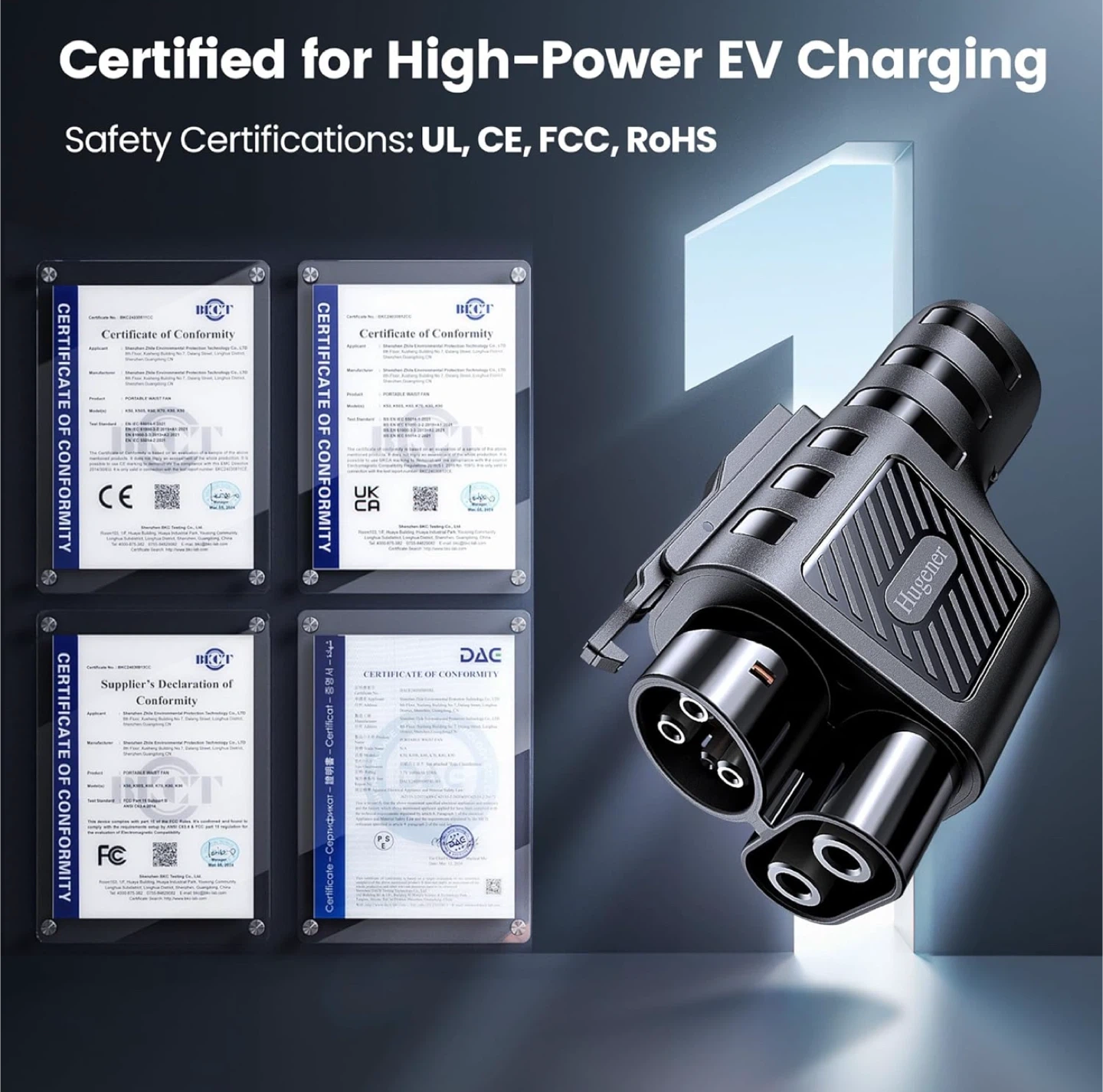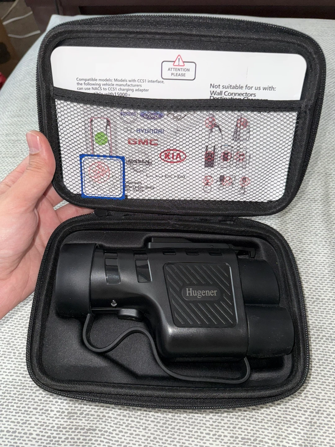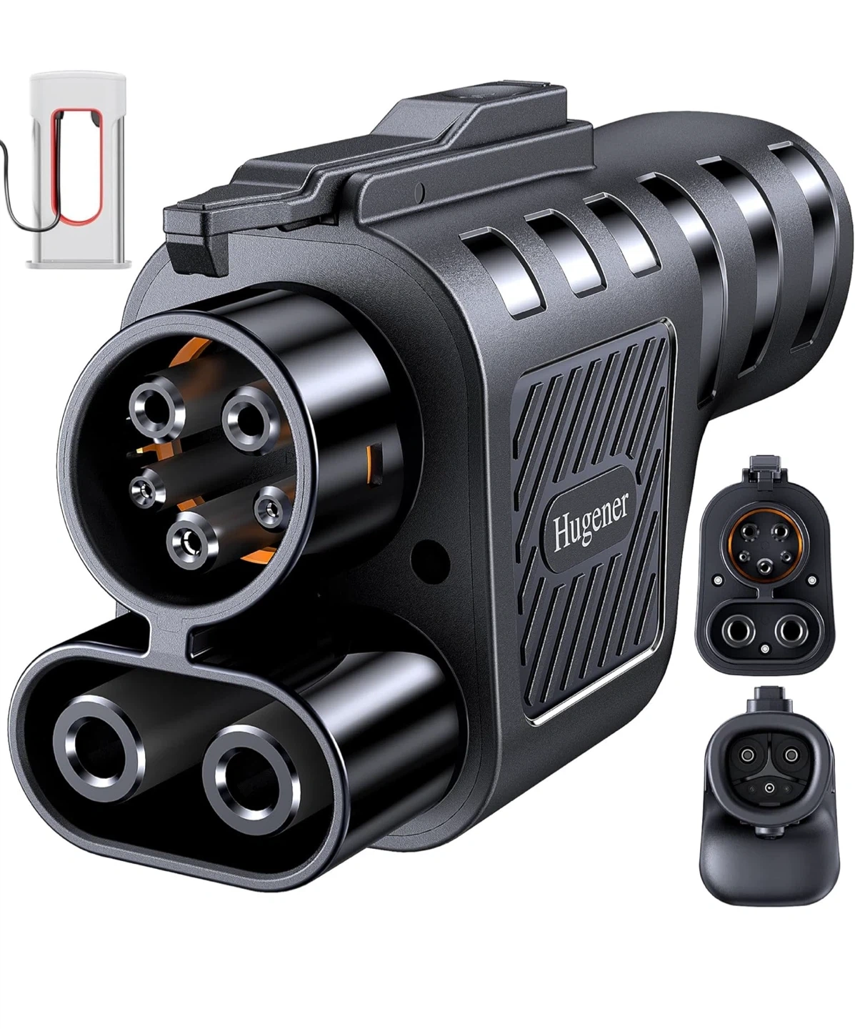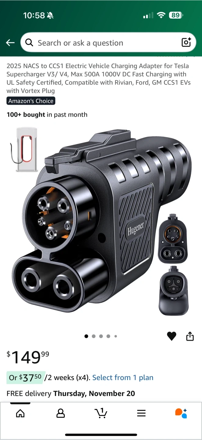 Selling a Hugener NACS to CCS1 electric vehicle charging adapter. It is compatible with Tesla V3/V4 Superchargers. It allows for 290km/180mi in 15 minutes of charging. It has a 3-sensor smart temp control and operates in extreme cold & heat (-22°F to 122°F). Charging rates down at 158°F and charging stops at 194°F. Originally bought for $149.99